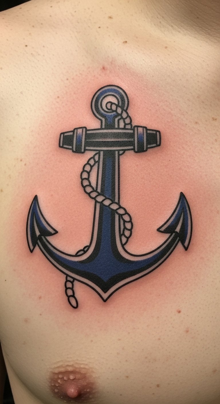 Classic maritime anchors are simple, meaningful, and age predictably. They’re great as first chest additions and integrate well into larger chest-to-arm patchwork later. Keep lines bold to avoid future blurring.