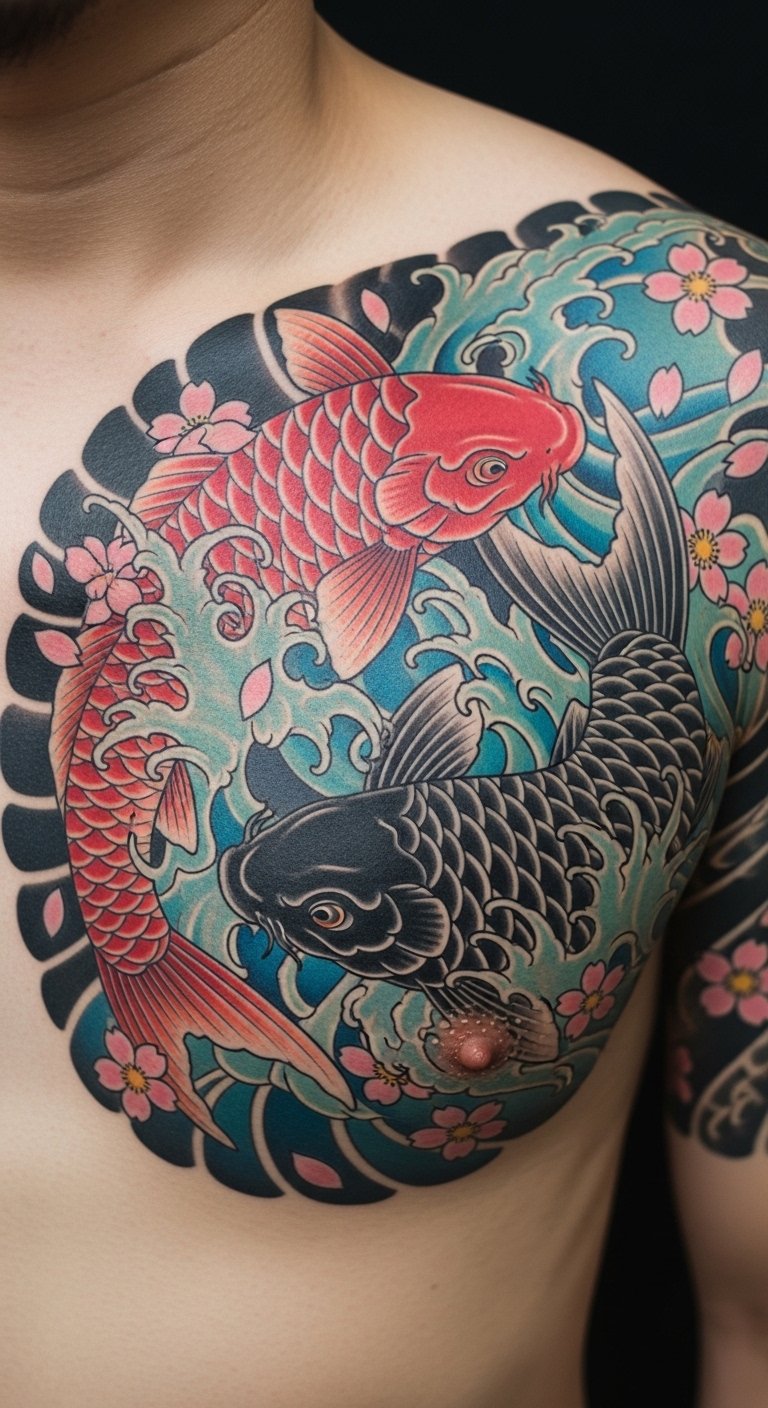 Japanese motifs read cinematic on the chest. Large scale and bold motifs help the design age well. Expect multiple sessions and staged healing. Discuss how the piece will integrate with future torso work.