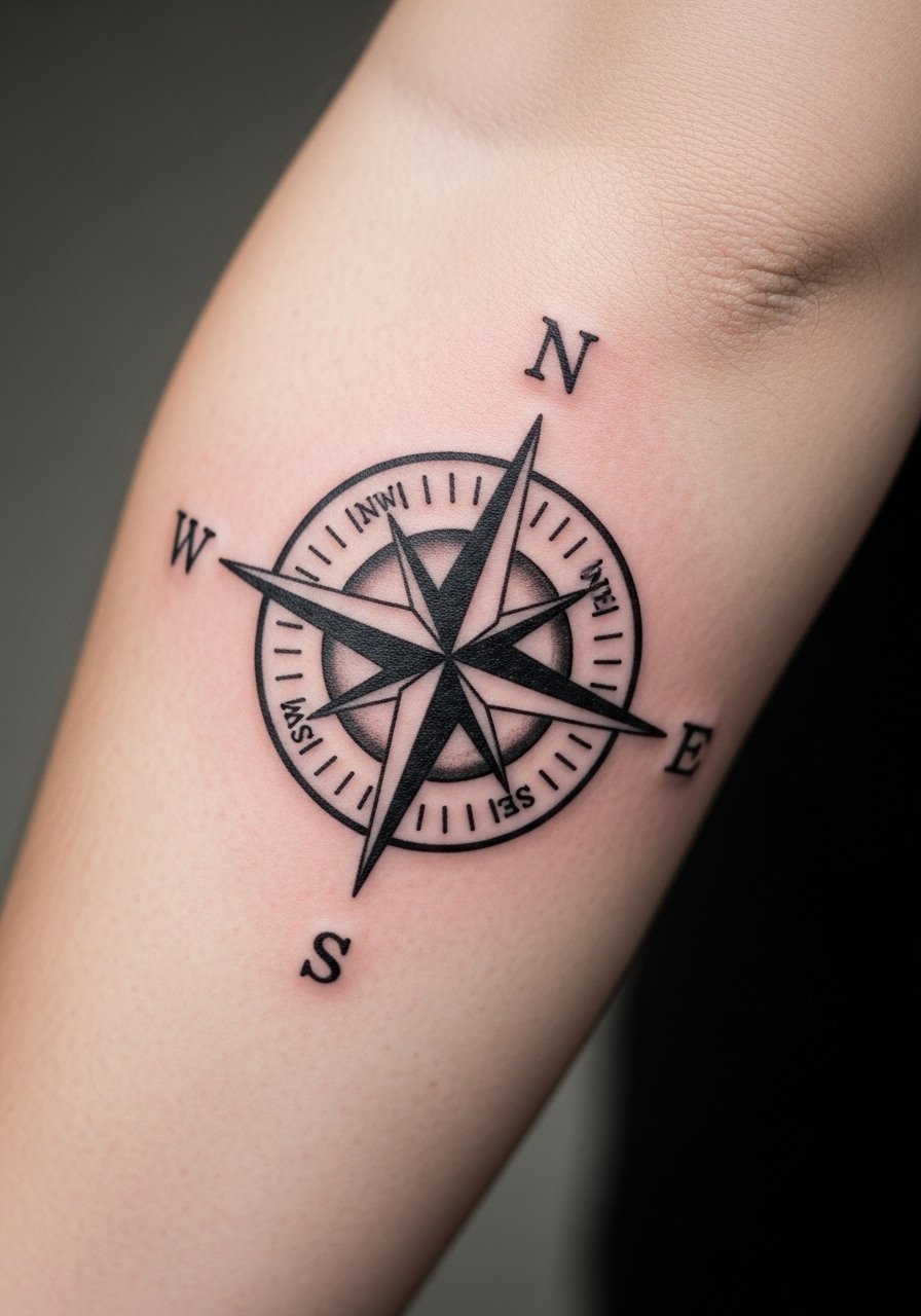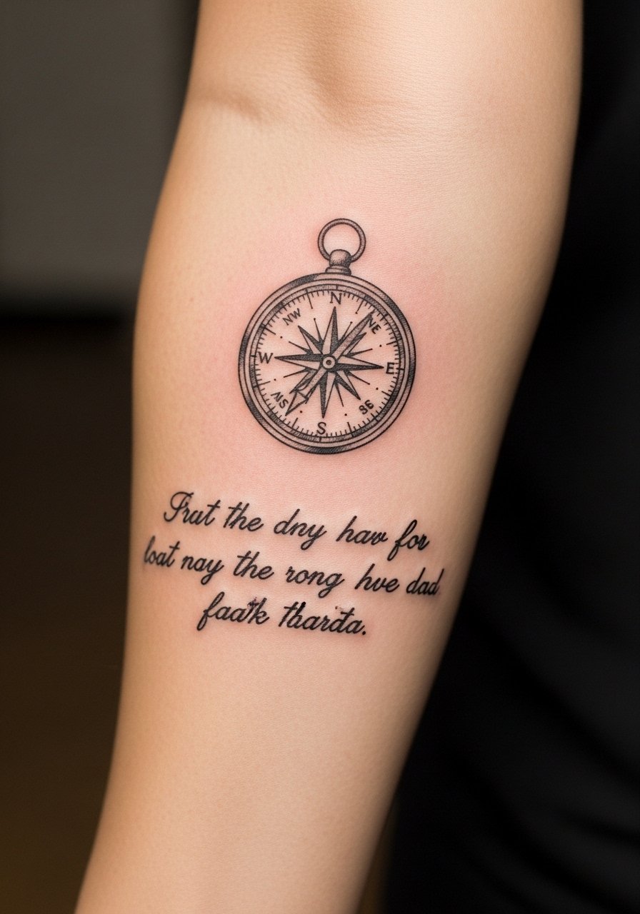 I love compass designs with a small engraved quote—short mantras like “stay true” add intention. Inner forearm is an ideal spot to read your own reminder. Script can blur, so choose clean, simple lettering and ask to see healed script work. This helps with regret: the piece is personal and meaningful rather than trendy.