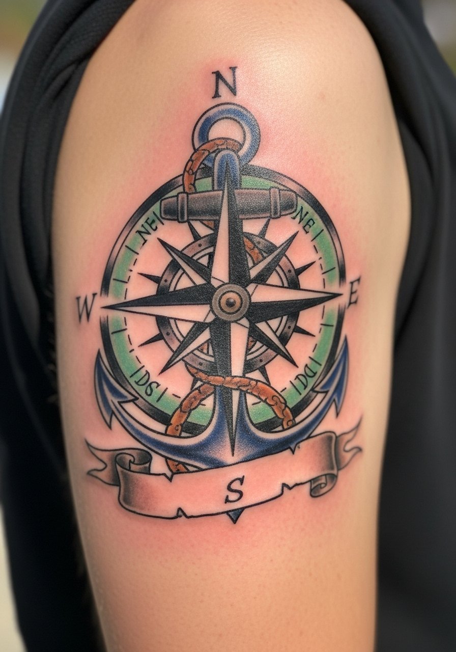 Pairing a compass with an anchor emphasizes safe returns and steadiness. I’ve seen this on chest and upper arm; upper arm is low pain and shows well. Traditional styles age predictably—thicker lines help with longevity. Don’t skimp on solid outlines or your artist’s nautical portfolio; someone comfortable with old-school linework will make it hold up.