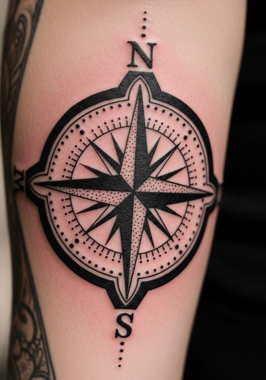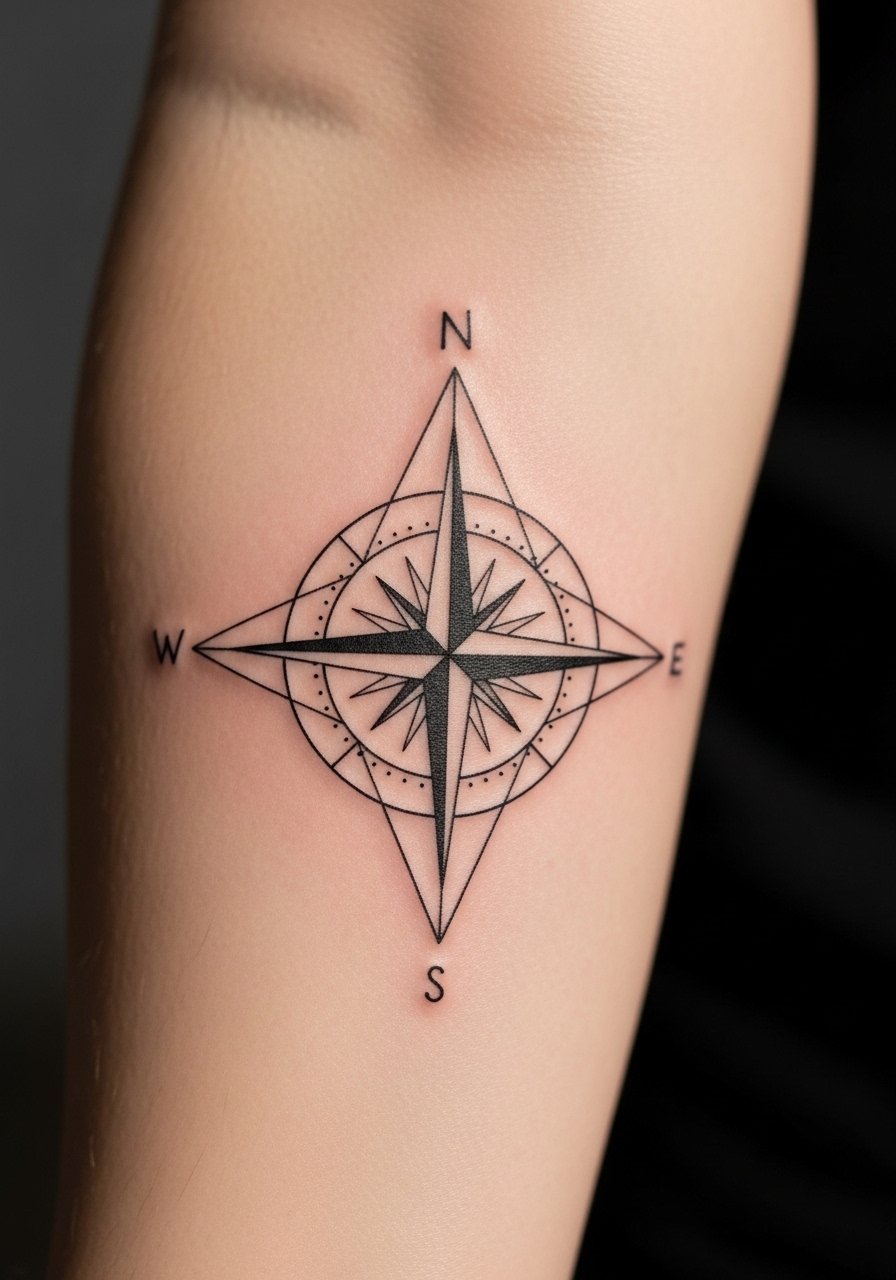 The compass rose is classic for direction and balance. I’ve seen artists add small element icons (fire, water) at the cardinals for deeper meaning. Forearm placement shows the design well and is lower pain, but it’s exposed to sun—use SPF. Mistake to avoid: cramming too much tiny detail into the center; it blurs over time. Look for an artist experienced in nautical motifs.