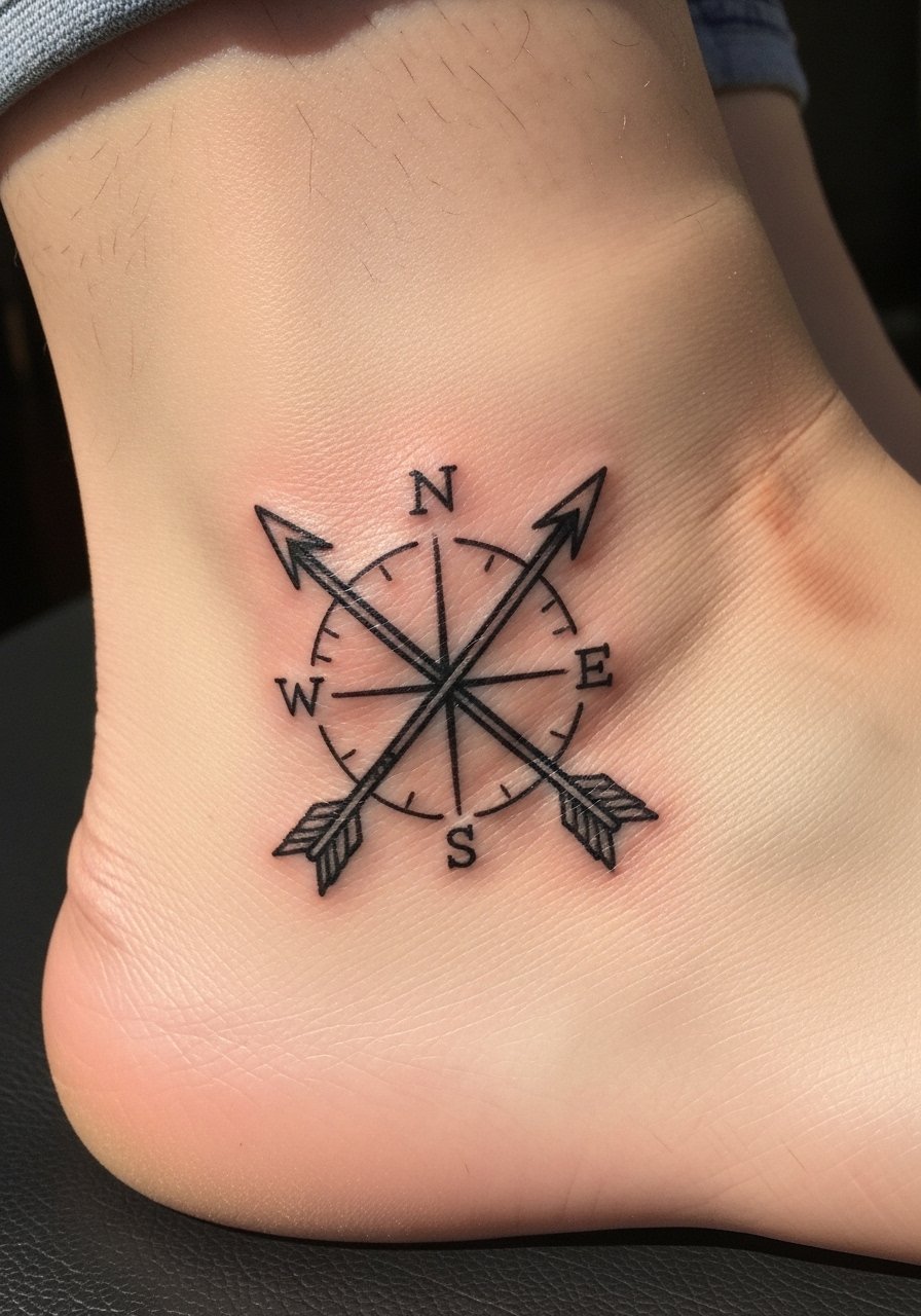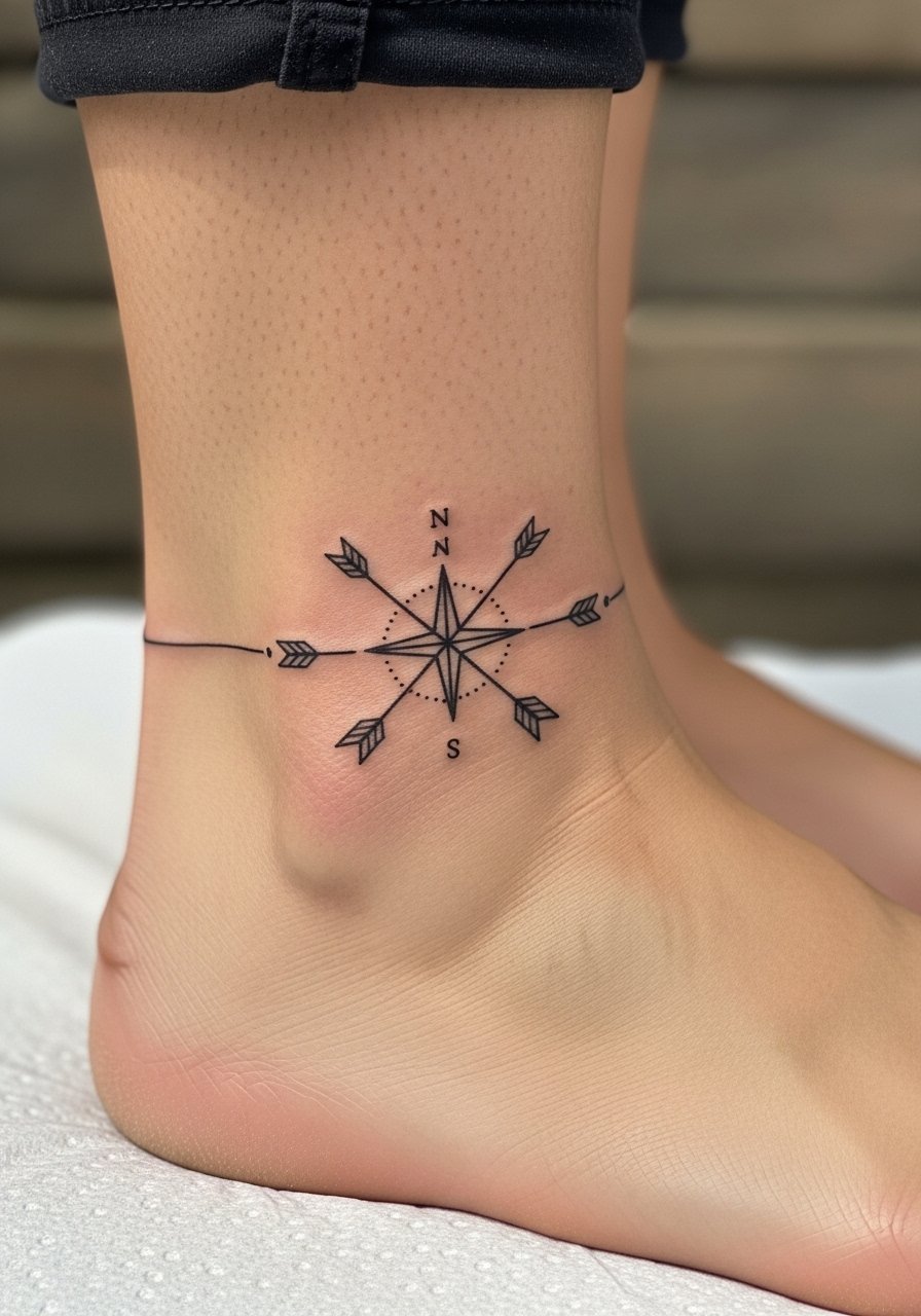 Crossed compass arrows around the ankle are a subtle friendship motif—great as matching pieces. Ankles tolerate small designs but can sting more than the arm. I recommend slightly bolder lines for longevity and discuss healed examples with your artist. This is one of those overlooked but meaningful compass tattoo ideas I’ve seen friends love.