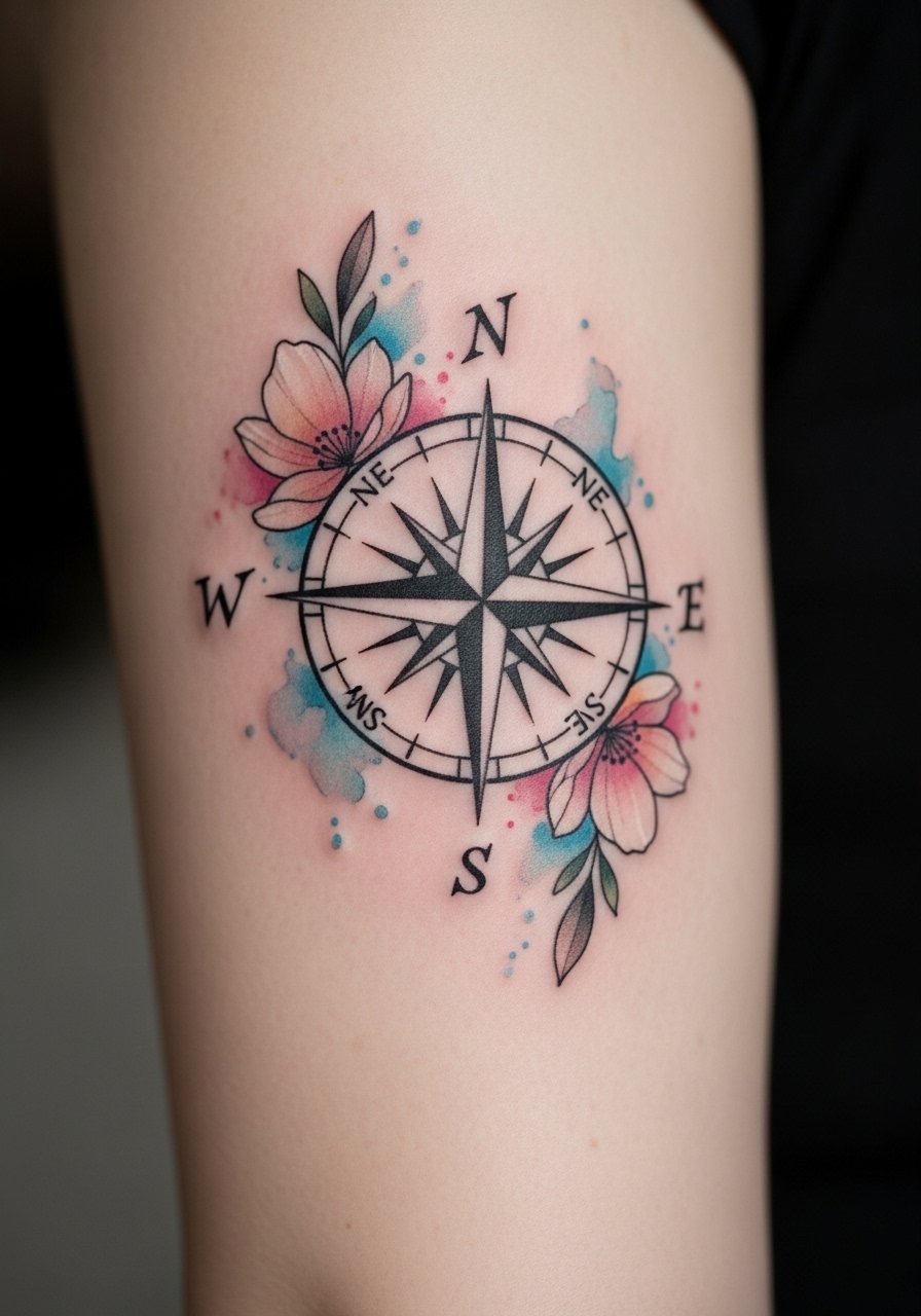 Adding flowers softens the compass and symbolizes guided growth. Inner bicep is a cozy spot—less sun, lower pain, easy to hide. Watercolor fades faster than blackwork, so I suggest pairing bright washes with solid black outlines. A common mistake is relying only on pastel colors; discuss saturation and healed examples with your artist.