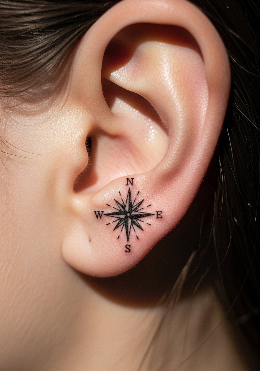 Behind-the-ear compasses are discreet and whisper their meaning. I like this spot for a low-visibility reminder. Healing is quick but be careful with sleeping positions. Artists sometimes warn the area’s thinner skin can make micro lines blur; choose someone who shares healed micro photos. This addresses first-tattoo anxiety—small and fast.