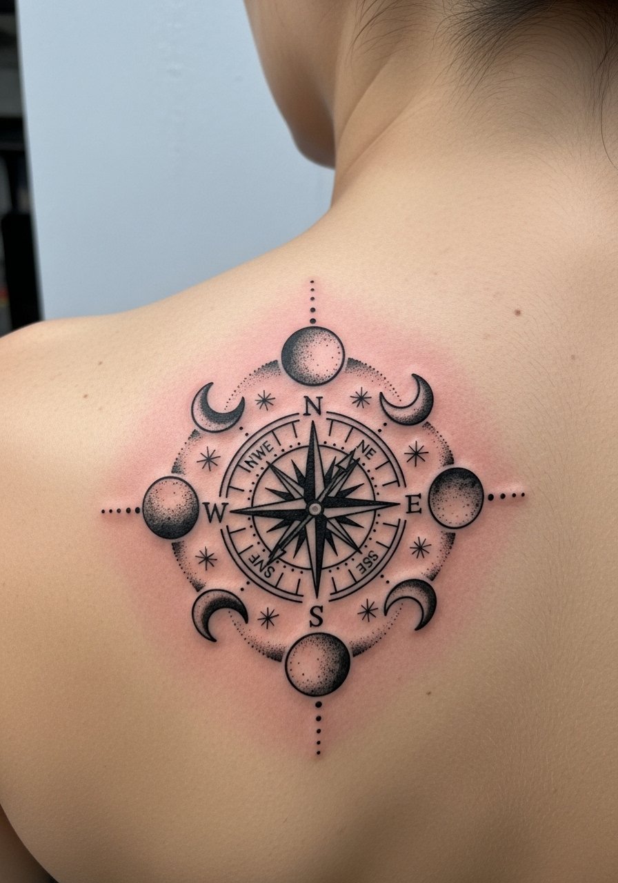 Adding moon and stars brings a spiritual navigation angle. Shoulder blade placement is great for medium pieces and has moderate pain. I’ve seen this age nicely if the artist uses strong anchors. Avoid very fine star points; bolder dots hold. I find cosmic additions make the compass feel internal rather than purely directional.