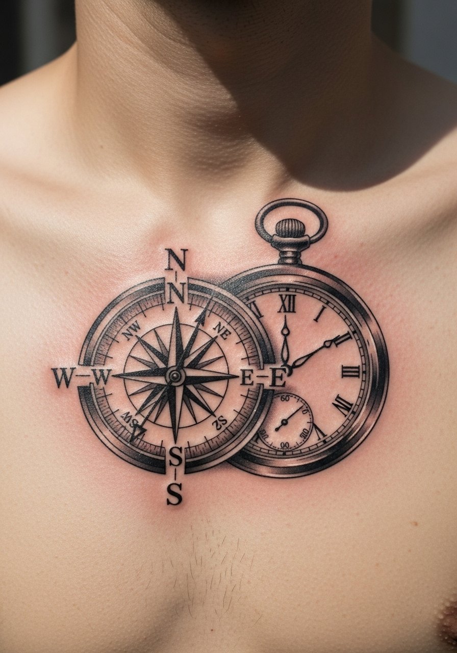 Merging a compass with a watch suggests time and direction—great for commemorating a life event. Chest placement gives space and visibility. I like how this reads healed: soft shading with strong edges. Ask an artist who does realistic shading; avoid tiny gears that will blur.