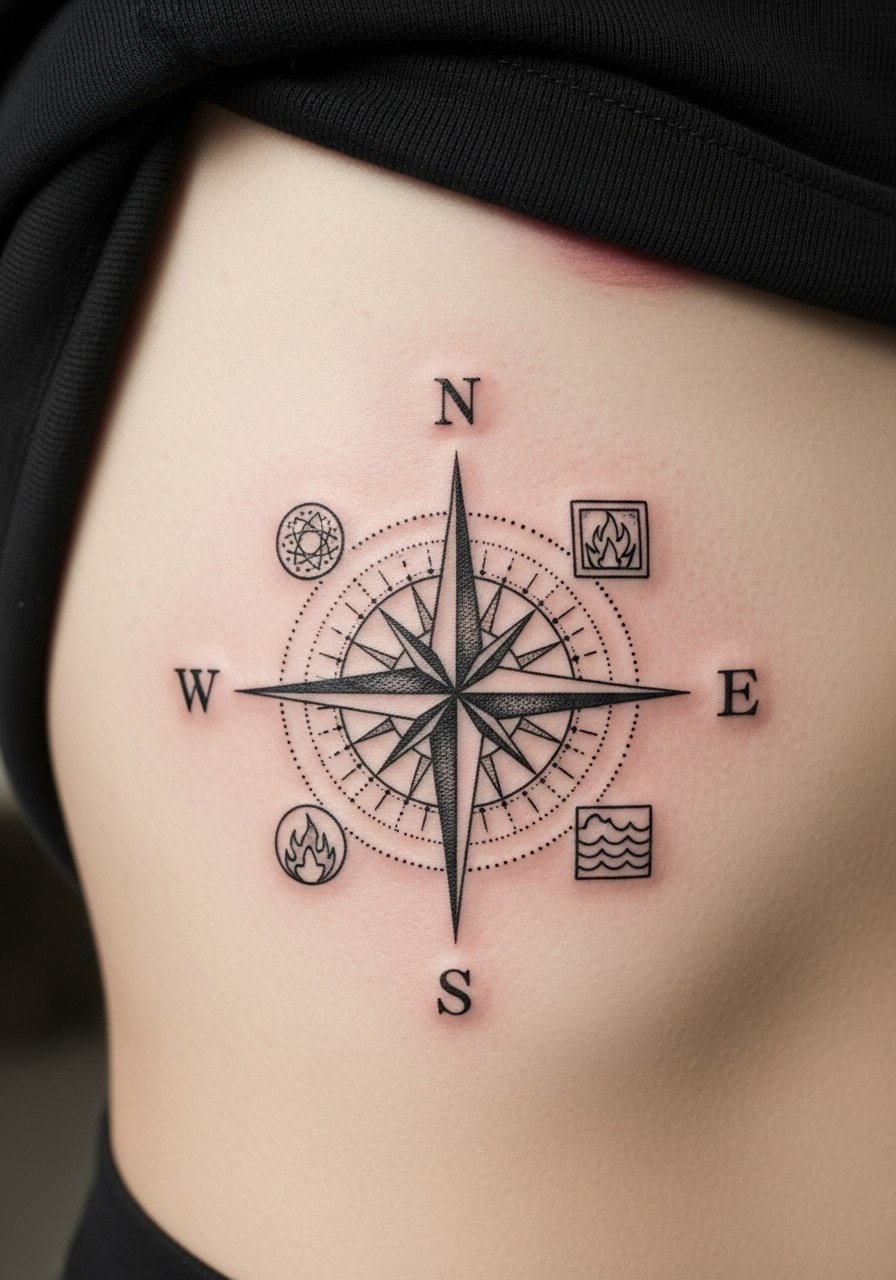 Including the four elements around a compass deepens the symbolism of balance. Ribcage placement keeps it private but is painful. I’ve seen this used as a hidden mantra. Discuss the icon size—tiny element marks can vanish, so ask for bold icons that still feel delicate.