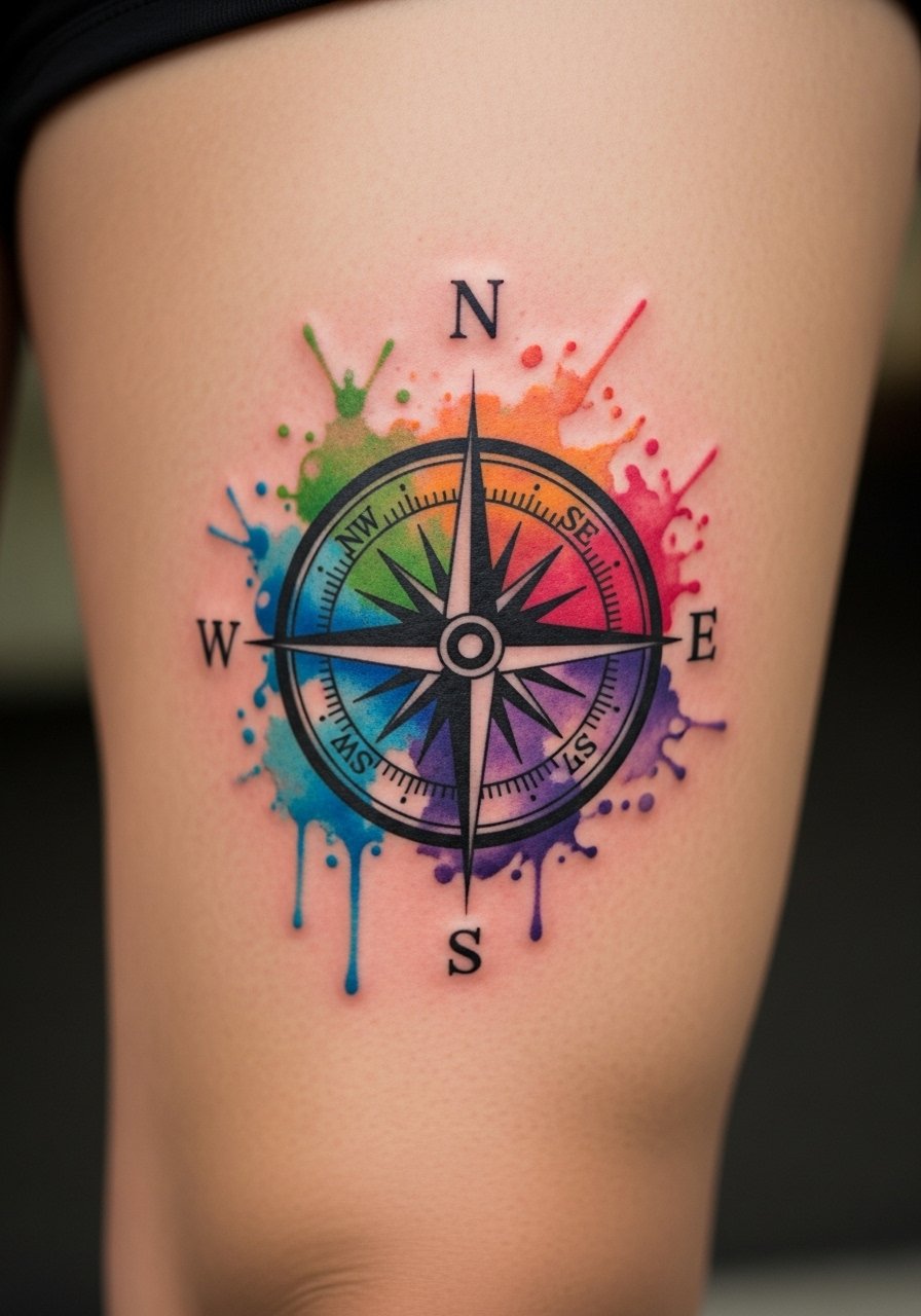 Watercolor compasses feel lively and artistic on the thigh. Thighs heal well and are easy to hide. I recommend pairing colorful washes with solid black lines to keep the compass readable as colors fade. Mistake: relying solely on pale pastels—ask for pigment depth and healed examples.