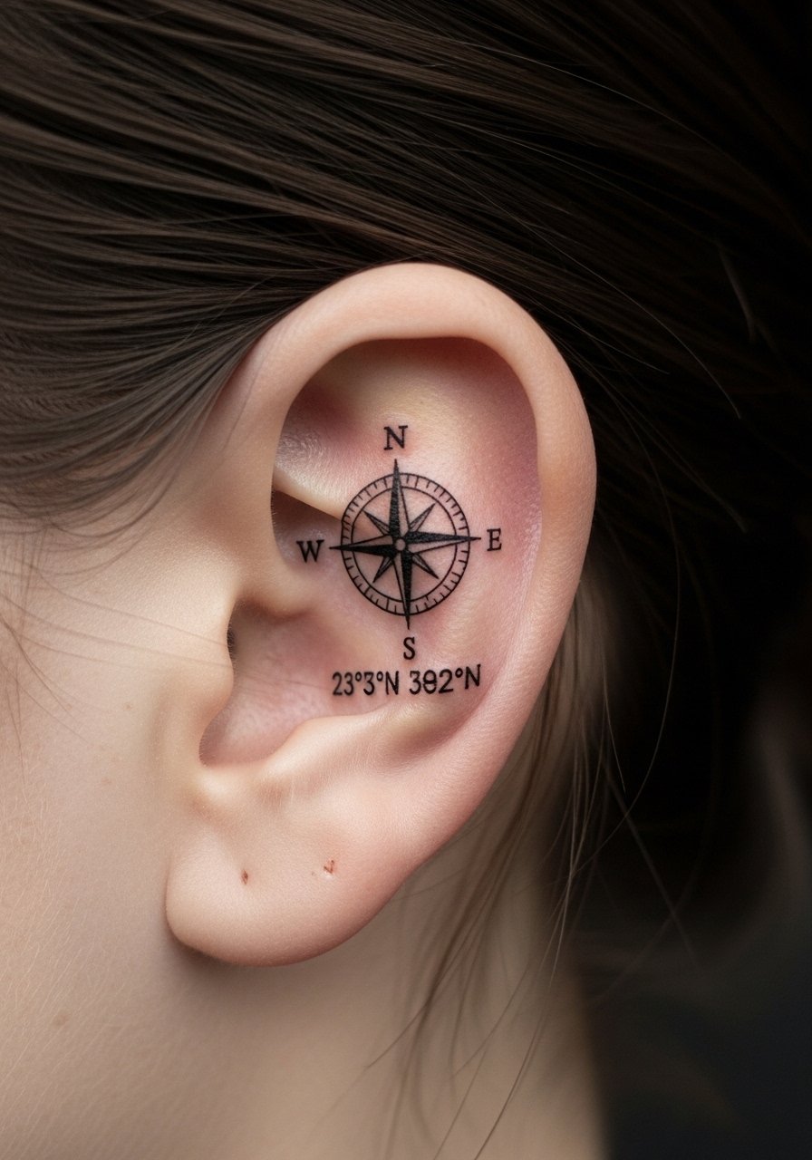 Placing coordinates with a micro compass behind the ear is a fresh take on marking a life moment. It’s discreet and personal. I used coordinates for the city that changed my life; it reads like a secret. Make sure numerals are bold enough to survive touch-ups if needed.