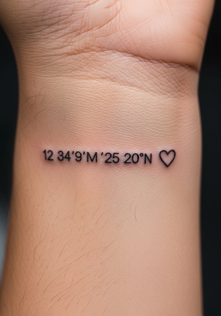I first saw this on a friend who used coordinates for where they met their partner. The inner wrist is tolerable pain, maybe a 3 out of 10 for most people. Ask your artist for slightly thicker fine lines, not hairline traces, so the numbers remain readable after a year. In my experience, pure hairline coordinates blur into a grey smudge after two years. Session time is short, around 15 to 30 minutes. Tell your artist you want legible numerals, not calligraphic flourishes. Many people skip adding a tiny marker like a heart. Don’t pick elements that are too small. Tiny hearts often heal poorly if under 5 mm. For cleaning, use a fragrance-free soap and a light moisturizer. I’ve noticed inner wrists get sun exposure on the back of hands most days. Use SPF once healed.