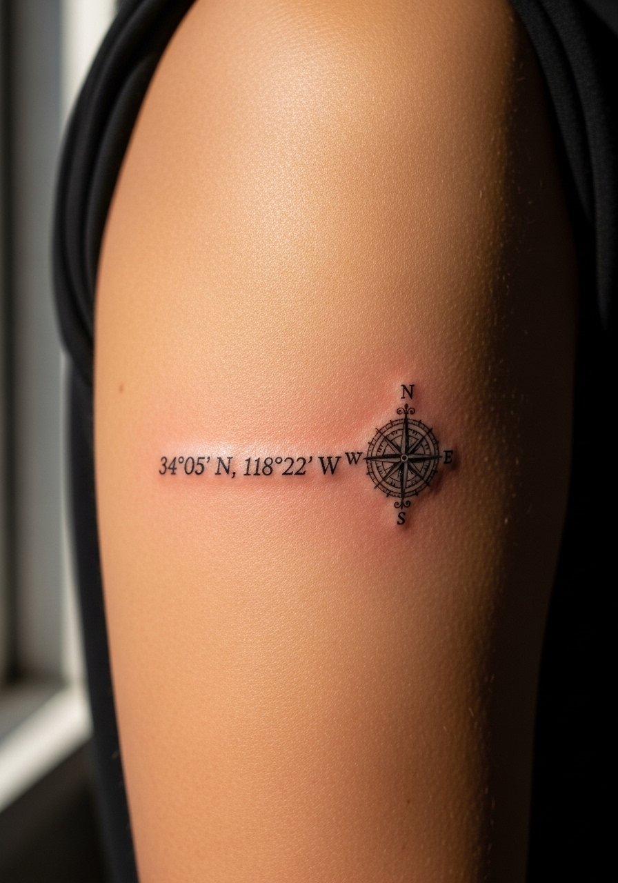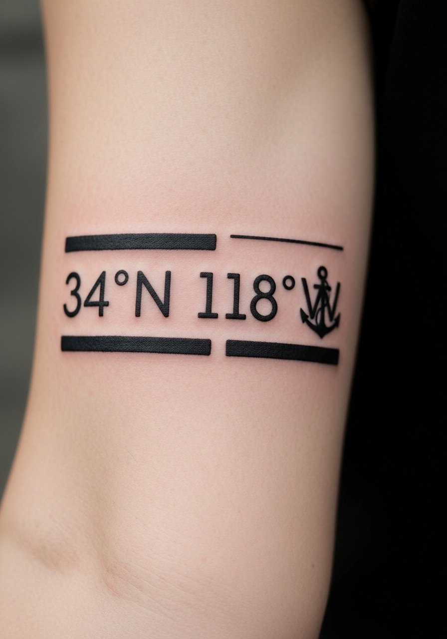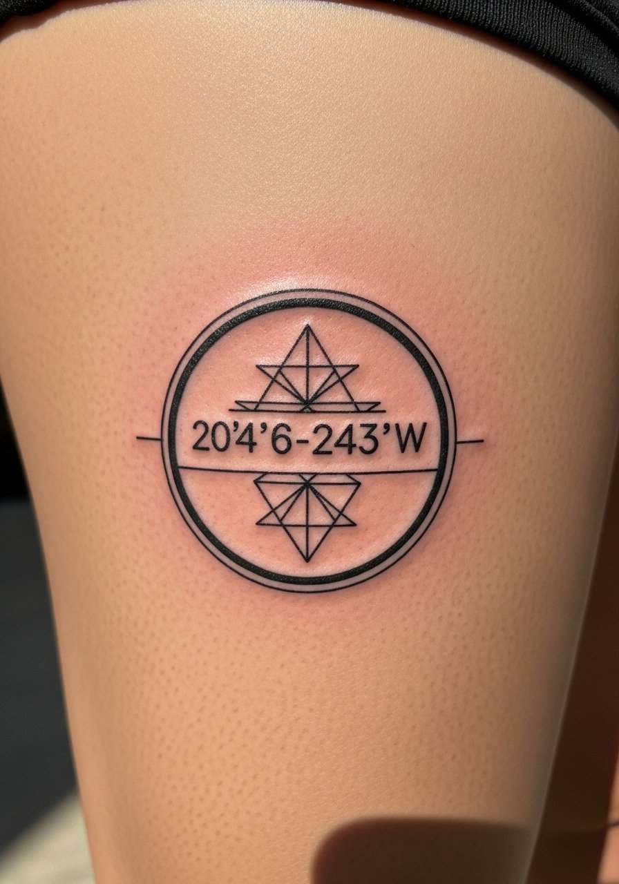 Thighs are forgiving and less painful. I like how the encircled layout turns coordinates into a badge. Request bold numerals and a thin ring for contrast. If the ring is too thin it will blur into the numerals over time. Sessions are usually 30 to 60 minutes. At eight months the black ring keeps a strong silhouette. The common mistake is making the ring decorative with filigree close to numbers. Keep negative space between elements. Thighs allow larger scale, which helps longevity.
