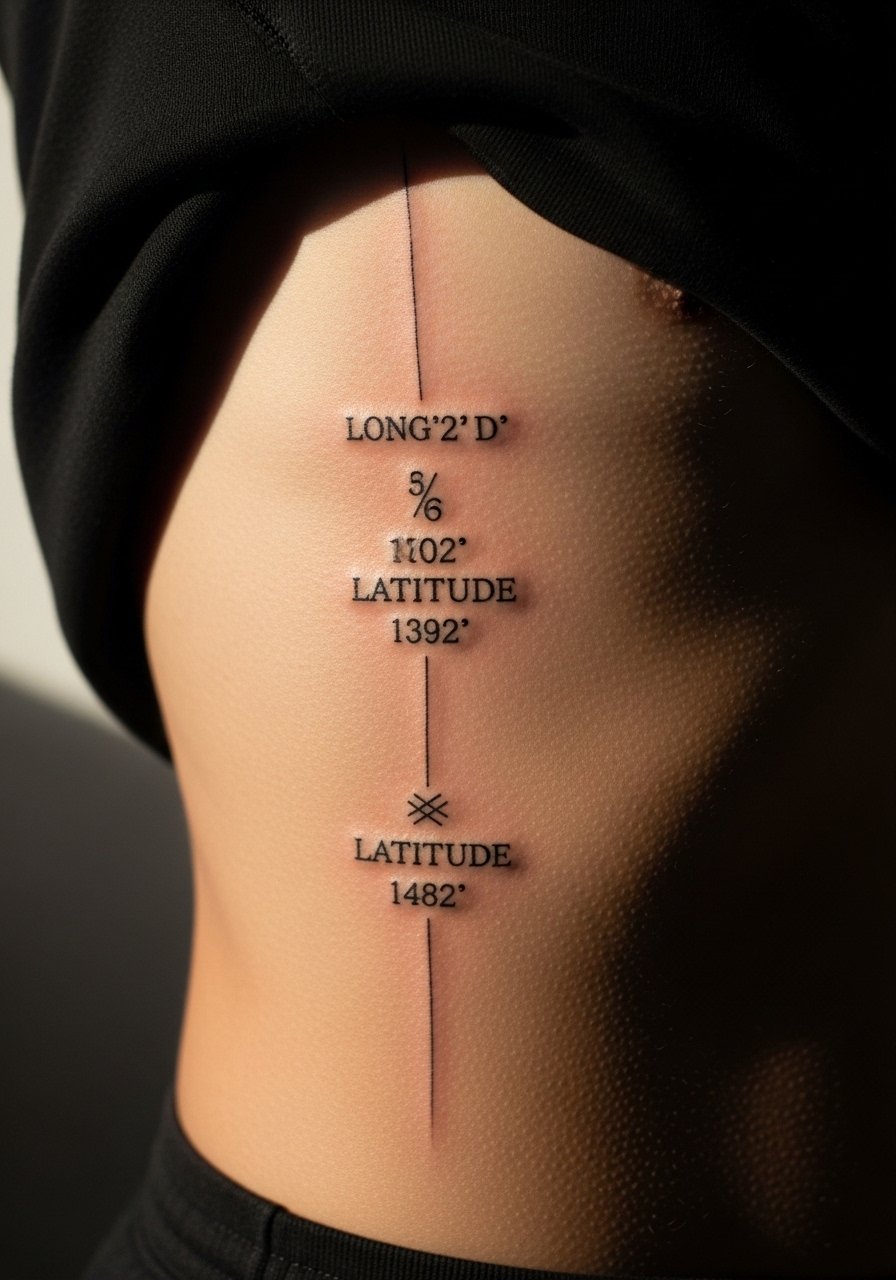 Fair warning, the ribcage is painful. I rate it a 7 out of 10 personally. The vertical layout follows the torso lines and can look elegant. Session time varies. If you plan for a longer string of coordinates, split it into a session segment so you do not tense up. I recommend slightly heavier line weight than pure hairline. From what I’ve seen, the ribs move during breathing and tiny numerals can break up. During consultation, ask the artist to bend and breathe while they place the stencil. Expect two weeks for surface heal and a few months for flaking to finish. The usual mistake is requesting ultra-fine numbers on a high-movement area. That fails more often than not.