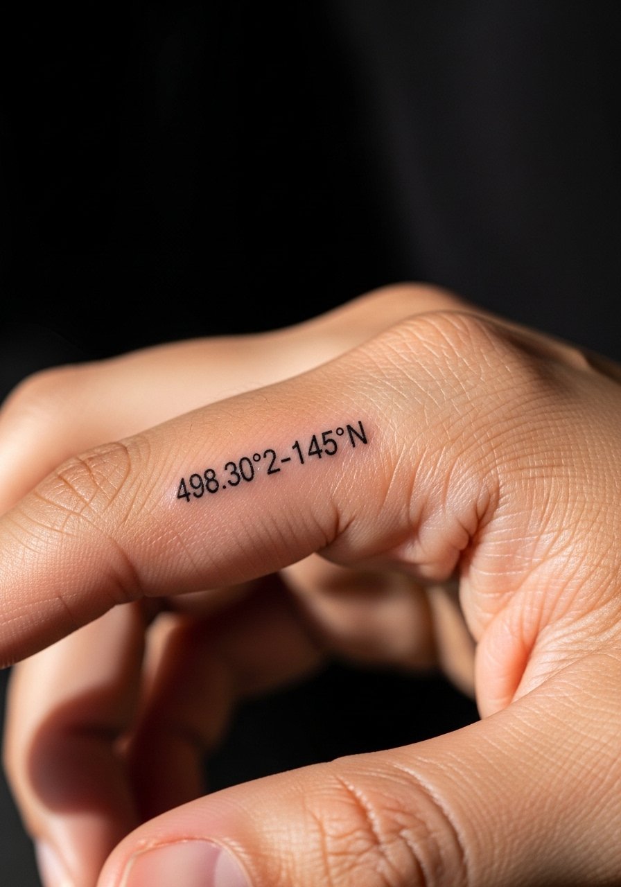 Finger tattoos are notorious for fading. I learned this the hard way. If you want side-of-finger coordinates, accept regular touch-ups will be needed. Pain is sharp but quick. The session is short. Ask your artist to inject a slightly bolder line and avoid filling. I have seen filled numerals turn into blobs faster than thin lines. At six months you will see early fading. At two years it may be patchy. If you want longevity, move the design to the base of the finger or inner hand. The common mistake is picking a placement that receives constant washing and friction. Fingers get the worst of that.