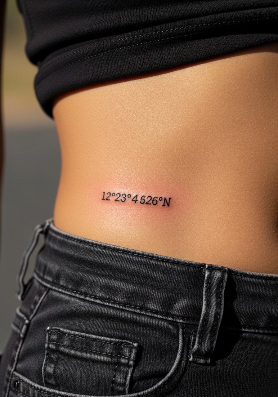Vertical spine placements draw the eye. Pain is variable depending on closeness to bone. I felt discomfort in short bursts during mine. For fine line coordinates here, ask for medium-weight lines so the numbers survive movement and mattress contact. Expect a session under 45 minutes. Healed, the ink sits nicely except where sheets tug during sleep. The big mistake is picking extremely delicate numerals. Also, tell your artist to test stencil alignment while you stand straight and while bending. The spine moves more than people assume.