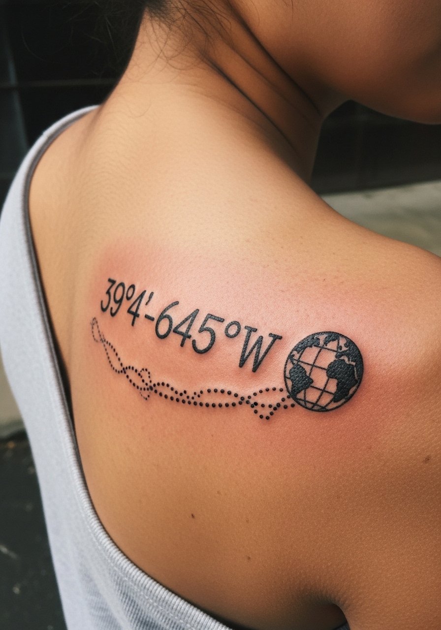 10. Dotwork Coordinates With Globe On Back Shoulder