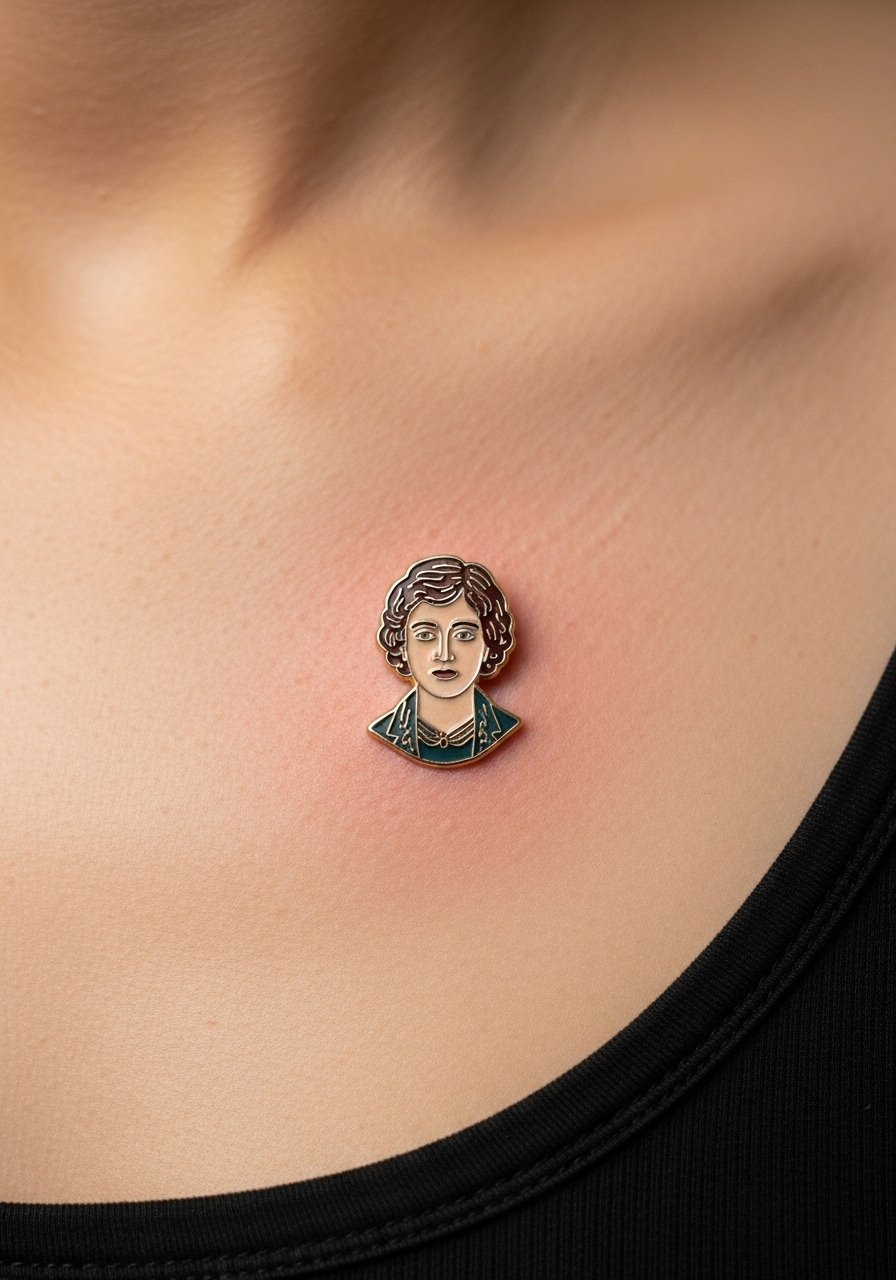15. Micro-Realism Coordinates With Tiny Portrait Pin On Upper Chest