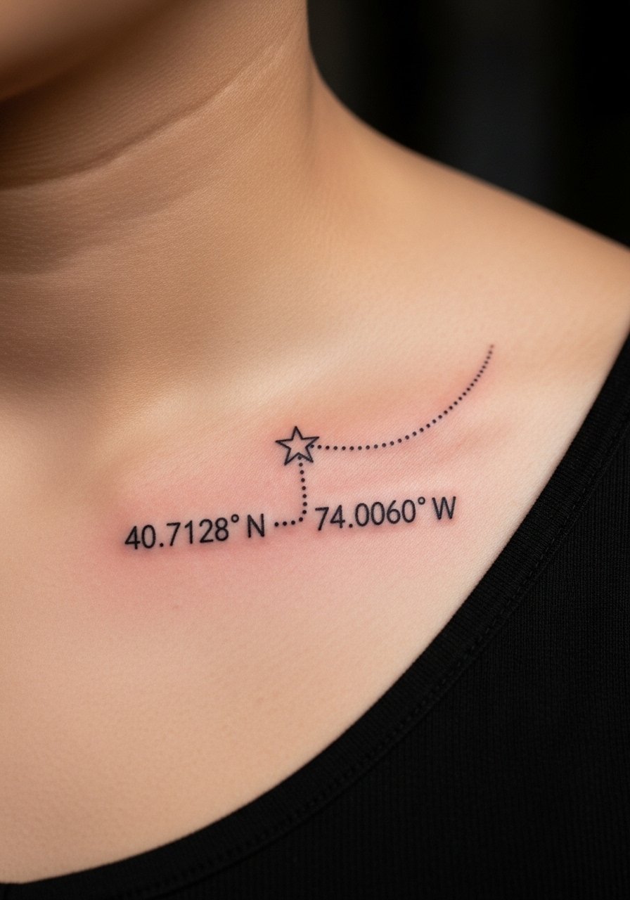 I first noticed dot-line accents in an online portfolio. The clavicle has movement when you raise your arm. Pain is moderate. The dot line helps the coordinates feel like part of a connected mark. Ask your artist to place the star off-center if you want asymmetry. People often ask for too many dots close to the numbers. That can cause poor healing if dots are dense. Sessions are short. Over time the dots will soften more than the numerals. For protection, avoid heavy backpacks during the first week.