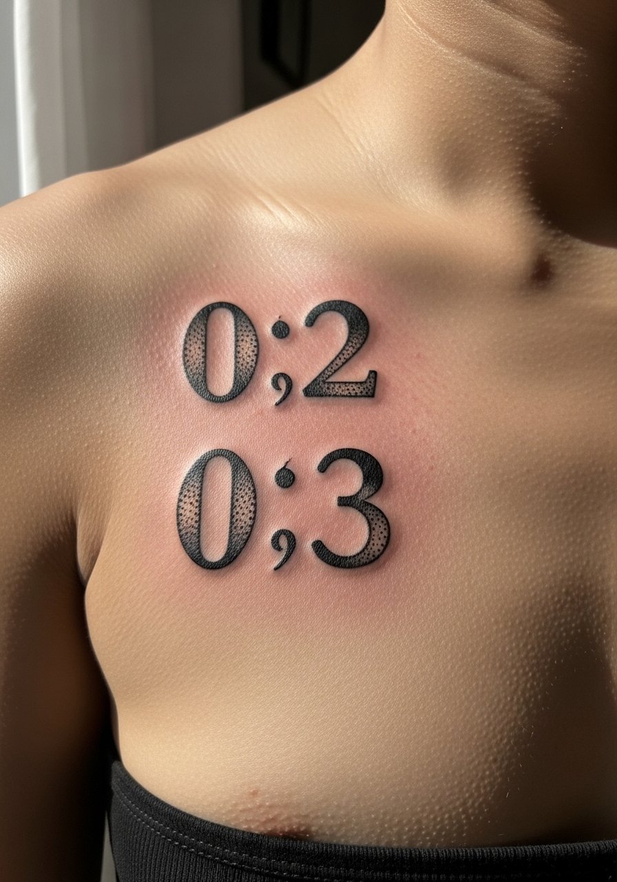 Collarbone placement reads like a subtle banner. I first saw this on an artist’s portfolio during an in-studio visit. Pain is moderate due to bone proximity. Ask your artist to contour the numbers to the collarbone curve. If they place numbers in a straight block, the piece can look stiff. Expect a session under 30 minutes. Aftercare must guard against necklaces and straps rubbing. I’ve seen collarbone numbers blur where clothing rubbed them during the first two weeks. A common mistake is wearing tight tops too soon. Keep it clothing-free when possible during initial heal.