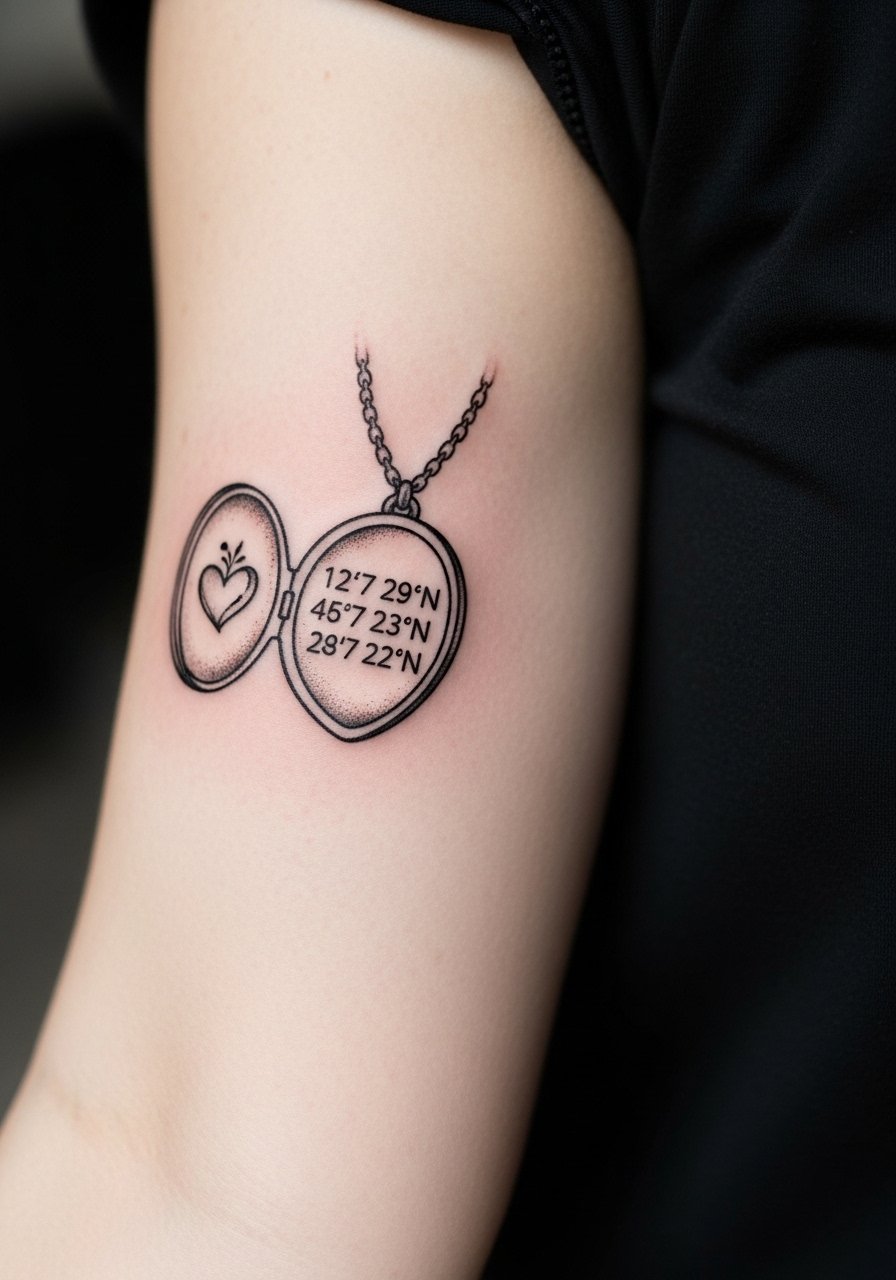 22. Coordinates Encased In Small Locket Tattoo On Inner Arm