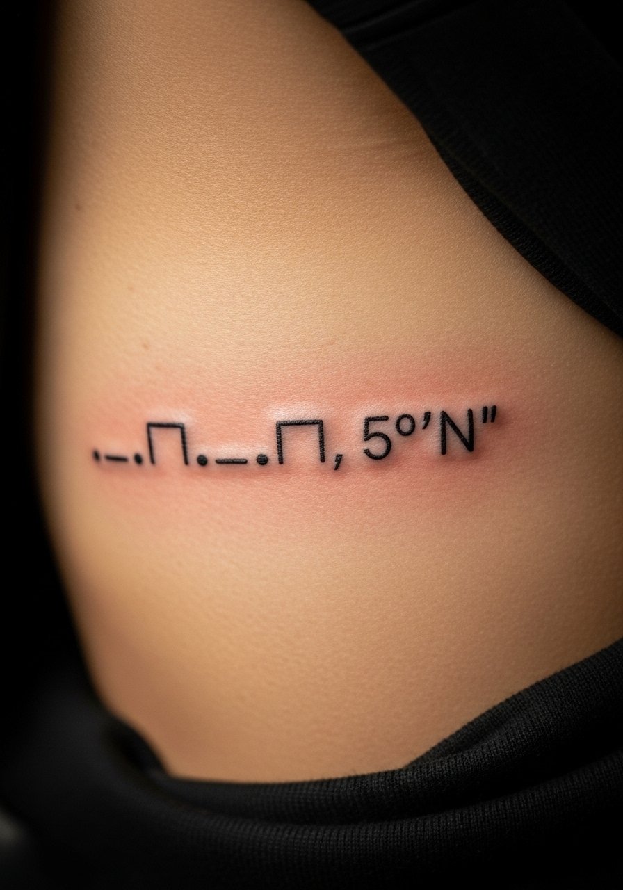 Morse code coordinates feel private to those who know how to read them. The rib side hurts. I felt waves of discomfort. The advantage is this style reads as design to strangers. Ask for consistent dot sizing and dash length. The mistake I see is inconsistent spacing that breaks decoding later. Sessions can take 30 to 60 minutes depending on length. Healed results are subtle and age gracefully because the small shapes blur evenly. If you plan to decode visually, keep an identical spacing guide for the artist.