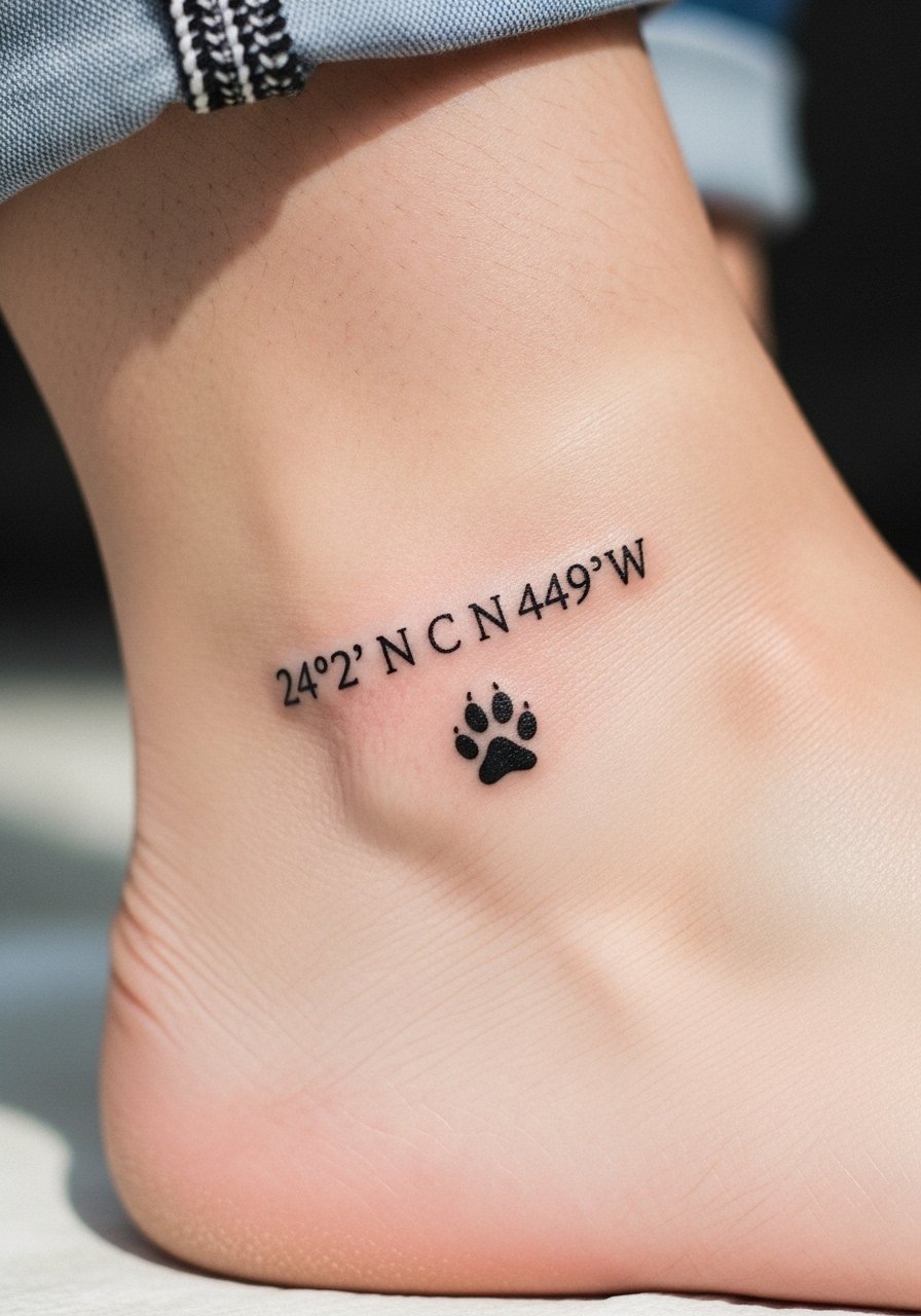 I remember a client who used coordinates and a paw print for a pet resting place. Inner ankle pain is moderate and the area rubs from shoes. Ask for a slightly bolder paw outline so the tiny toes do not disappear. Many pick delicate paw lines that soften into indistinct marks. Session time is short but healing needs protection from footwear. A hydrocolloid patch at night reduces friction while sleeping. At six months expect minor fading where shoes hit. A touch-up is common after a year.