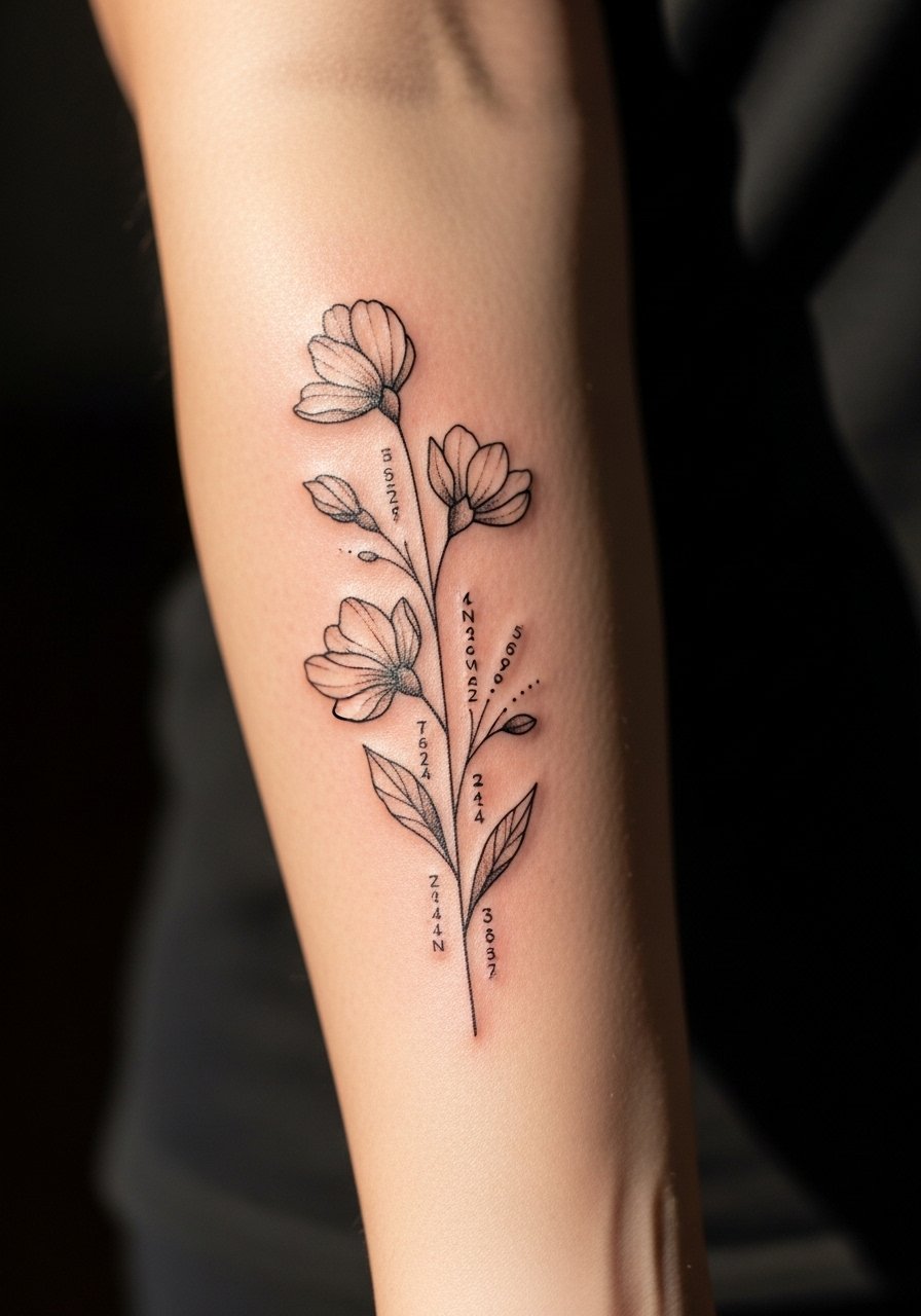 I used this idea when I wanted the numbers to be private yet visible to me. Inner forearm pain is low. Integrating coordinates into a stem looks beautiful but demands spacing. Tell your artist to prioritize number legibility inside the stem. The common mistake is making the stem too busy so digits touch petals. Session is 45 to 75 minutes for combined floral and numbers. Healed, the forearm keeps detail well, but expect light softening on the thinnest lines after two years. I asked for a small gap around each numeral and that paid off.