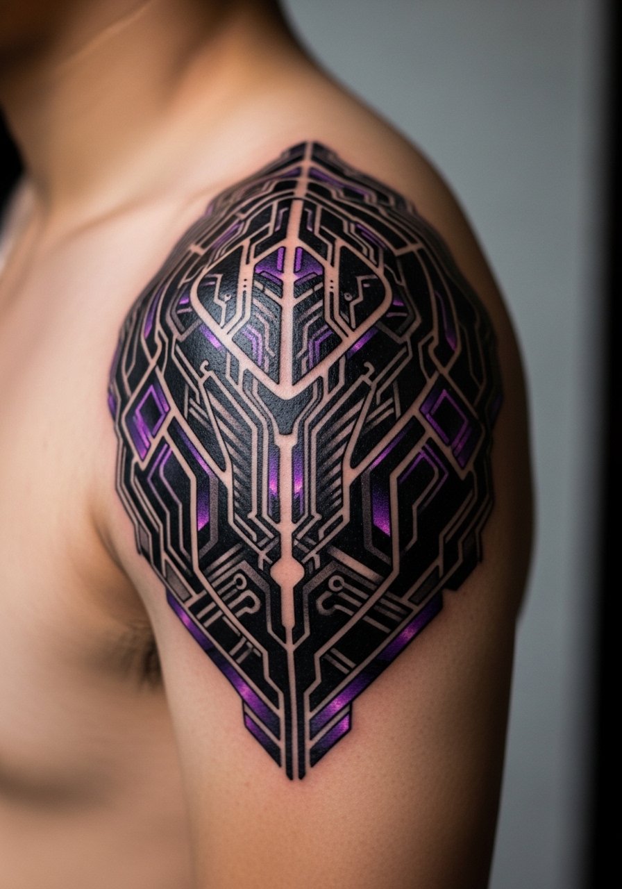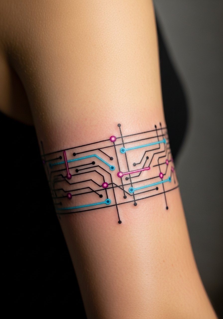 Someone I know first saw this on a forearm and booked the same day. It reads clean from a distance because the core grid uses solid black linework with thin neon highlights layered on top. Tell your artist you want a black base and neon accents so the color sits on top of saturated ink rather than relying on hairline neon alone. The armband placement is forgiving for a single-session medium piece and the pain is moderate. Common mistake is making the grid too tight, which risks blur and blowout after two years. Expect a touch-up around year two if you wear sun-exposed sleeves a lot.