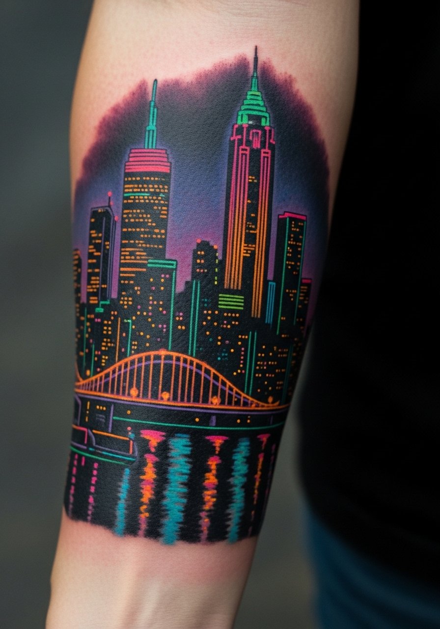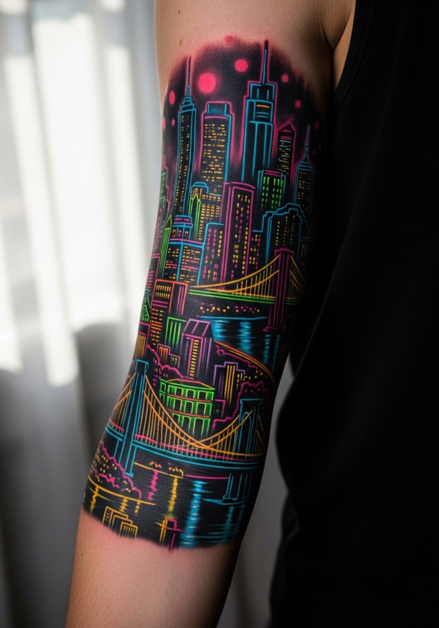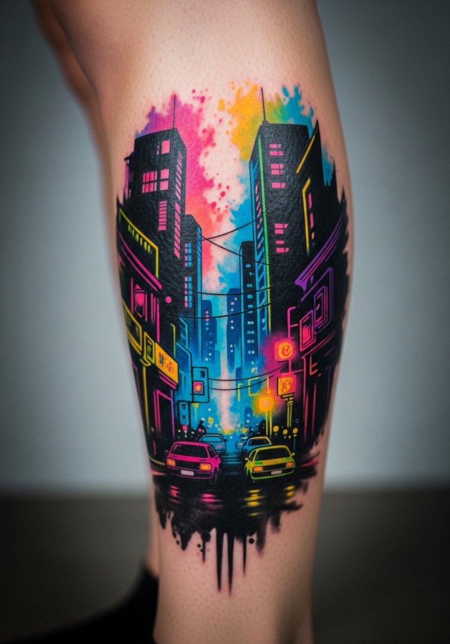 Most large watercolor-style city sleeves from several years ago have softened into muddy washes. This version keeps bold black anchors around color blocks so the skyline stays legible long term. For a sleeve plan on multi-session work over months. In conversation with your artist, describe which landmarks or architectural angles you want emphasized rather than handing over a full collage. The biggest mistake is asking for too many tiny neon details. Those fade and blur faster than larger color blocks, and they often need touch-ups after year two to retain their glow.