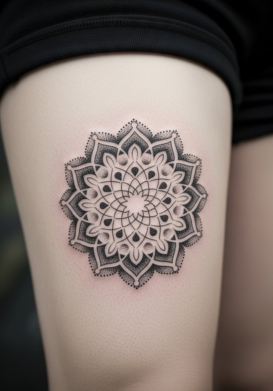 There is cultural history behind mandala-like patterns, so some people choose slight stylistic variations rather than direct traditional forms. The outer thigh is forgiving for size, which lets linework breathe and keeps blowout risk low. Ask for a mix of stipple shading and crisp linework and mention you want the circles to scale with movement so the pattern does not warp with weight changes. Thigh pieces age predictably well and usually need a touch-up around year three if you want perfect symmetry retained.