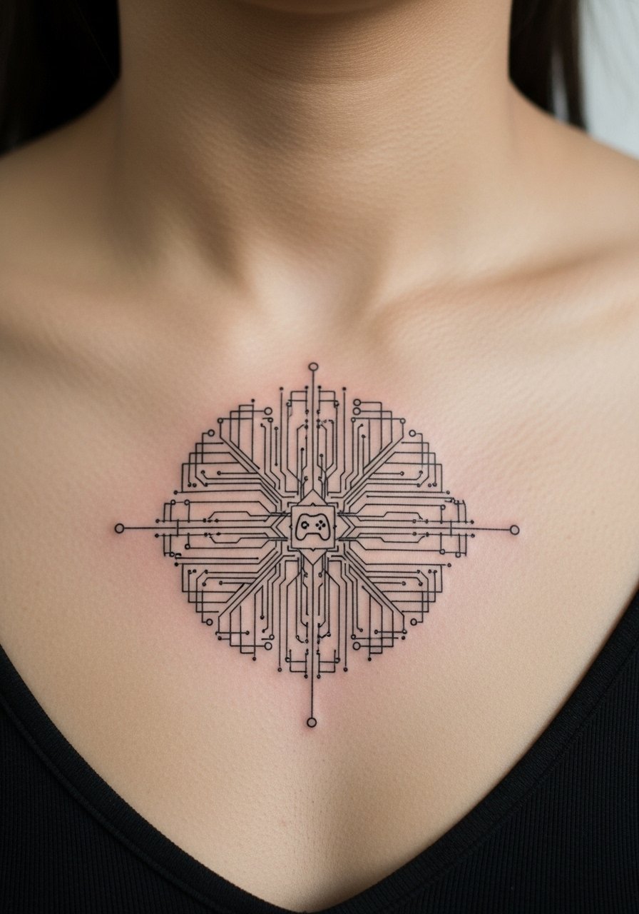 When you request chest circuitry, clarify how dense you want the pattern and which elements should remain focal. Sternum work can be higher on a pain chart and it needs a confident artist who understands spacing to avoid lines flowing into each other. A common error is crowding the design too close to the collarbones, which increases blowout risk. For fans of game icons, adding a small black glyph in the center reads well and avoids heavy neon that could wash out on some skin tones.