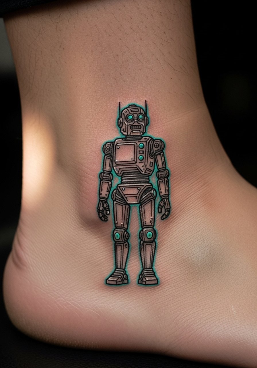 Ankles are small-session friendly and good for a first cyberpunk tattoo. Tell your artist you want a strong outline and modest neon spots rather than broad neon fills. The ankle area sees shoe friction, so thicker linework helps prevent early blurring. Sessions are short and pain is sharp but brief. A common mistake is asking for too much micro-realism in such a tiny area, which compresses detail and demands touch-ups within a year.