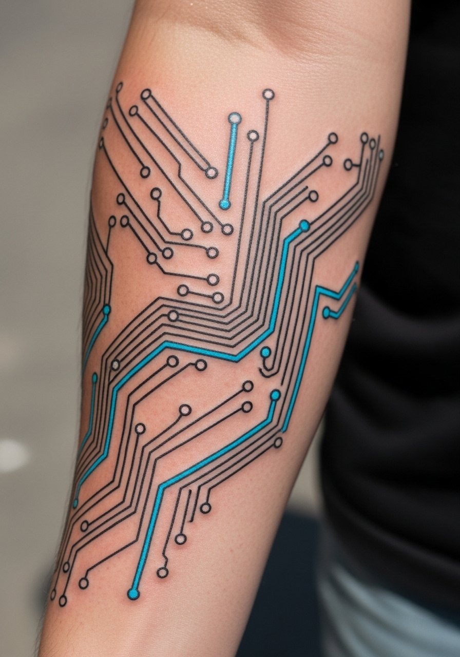 I chose this style after seeing a handful of artists use negative space to make circuitry read like wearable UI. It reads clean on the outer forearm because flat skin keeps thin lines steady. Expect buzzing discomfort—forearm is manageable but sessions can be long. Healing: fine lines may soften, so ask for slightly bolder line weights than you think. UV or neon ink pops fresh but fades faster; plan on touch-ups. Avoid overly dense micro-lines that blur into a gray mass over time. Ask your artist for steady single-needle work plus slight weight for longevity.