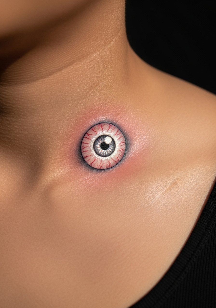 The collarbone gives a dramatic angle for a holographic eye design. It looks like a wearable HUD when color gradients are layered right. Expect sharp stinging on the bone; healing takes care and sleeping positions matter. Colors may mute as the skin regenerates—white highlights especially sink in and can disappear on darker tones. One mistake I see is relying on tiny white dots for contrast; ask your artist to build contrast with saturated mid-tones too. This piece reads as slightly eerie and very cyberpunk when healed.