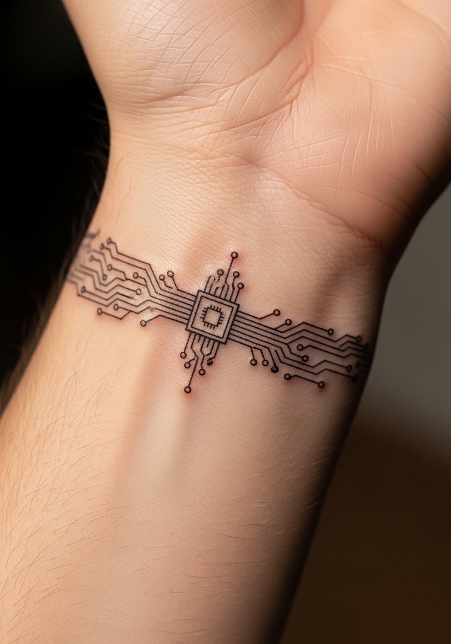 This wraps like a bracelet and reads like an implanted ID. Wrists are visible and heal relatively quickly but flexing can stretch lines—expect occasional touch-ups. Fine linework must be executed by someone used to thin, steady work. I’ve noticed bands with slightly heavier outlines settle better over time. Avoid extremely micro-detail; keep chip icon bold enough to read after healing. It’s a quiet cyberpunk statement that’s easy to conceal with a watch or sleeve.