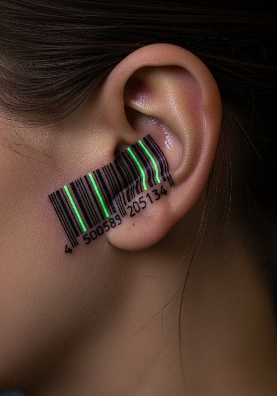 Behind the ear is discreet and surprisingly low on pain. A barcode with UV lines reads almost invisible in regular light but glows under blacklight—a fun party trick. UV inks fade quicker and need touch-ups; from what I've seen, artists often suggest black anchors to keep design readable long-term. Avoid placing super-dense chips here; the skin is thin and fine lines can blur. Check healed UV examples from your artist—results vary.