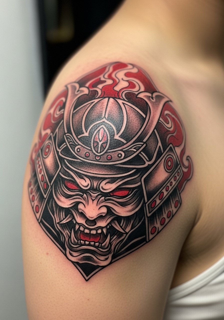 I fell for this after seeing traditional samurai motifs fused with mech plating. The shoulder cap reads like shoulder armor and wears well because shapes are bold. Shoulders are less painful and heal predictably. Colors like reds can shift; artists often layer blacks for lasting contrast. A common error is cramming too many small elements—let the armor plates speak in clear shapes. This one ages into a bold, graphic statement.
