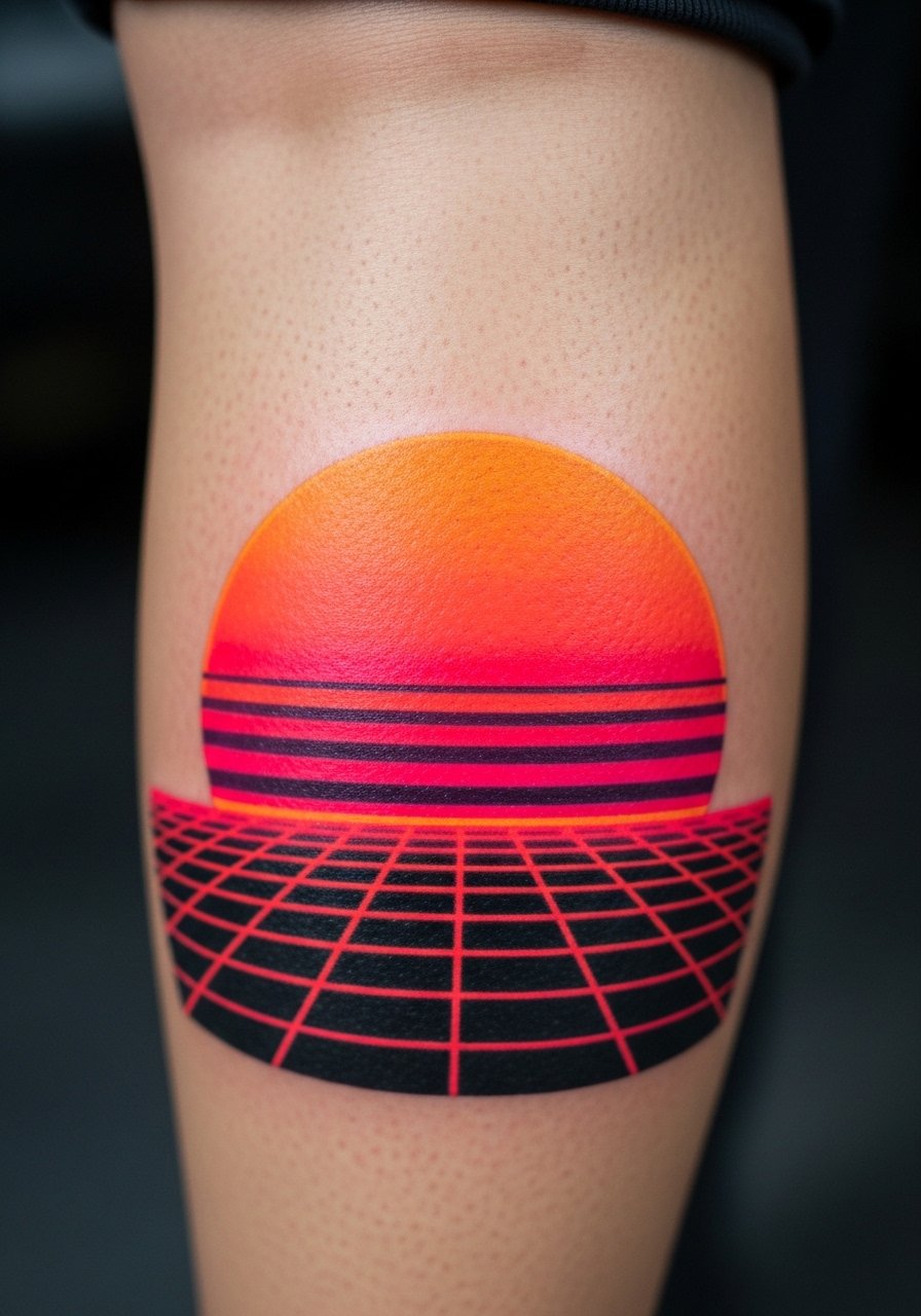 I love how synthwave palettes read as nostalgia-for-the-future. Calf placement is forgiving and shows the gradient well. Color blocks heal reliably if saturation is solid; thin gradients risk patchiness. Avoid super-fine grids that disappear. This reads bold from a distance and maintains silhouette as it ages, provided you protect it from sun.