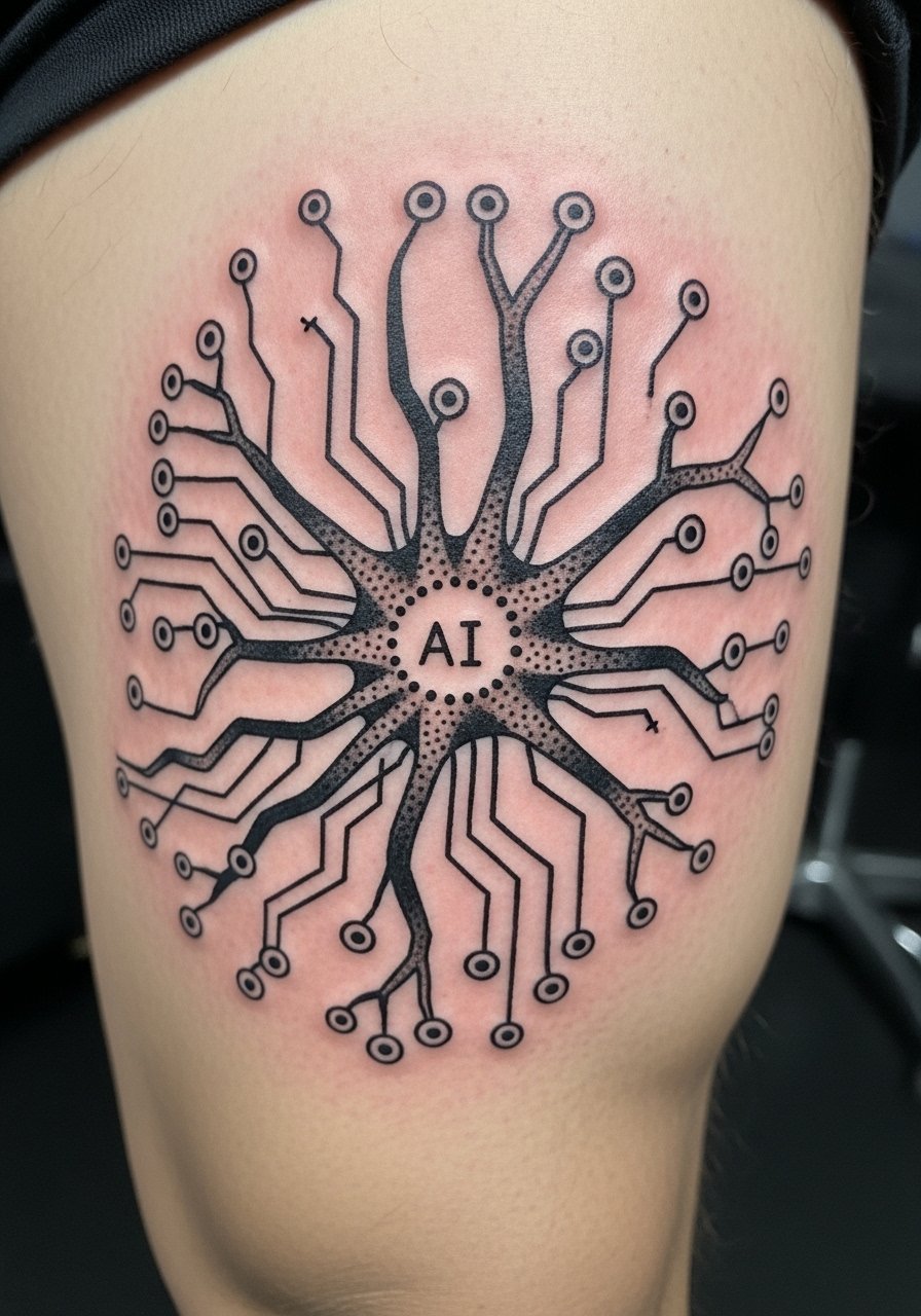 Thighs provide great real estate for neural net-like patterns—nodes and connecting lines that suggest thinking machines. Dotwork ages gracefully, but tiny dots can blur if too close. Pain is moderate on the fleshy thigh. A mistake is over-detailing nodes tightly; spacing preserves pattern clarity as the skin shifts. This looks best when scaled to the thigh's flow.