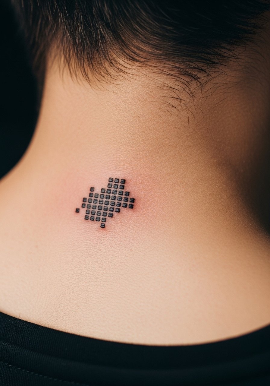 The nape is discrete and low on pain if you keep designs small. Pixel implants are minimalist but read as intentional tech marks. Hair covers them easily for work or formal events. Be mindful of tiny squares merging—spacing matters. This is a low-commitment way to test how you carry cyberpunk ink day-to-day.