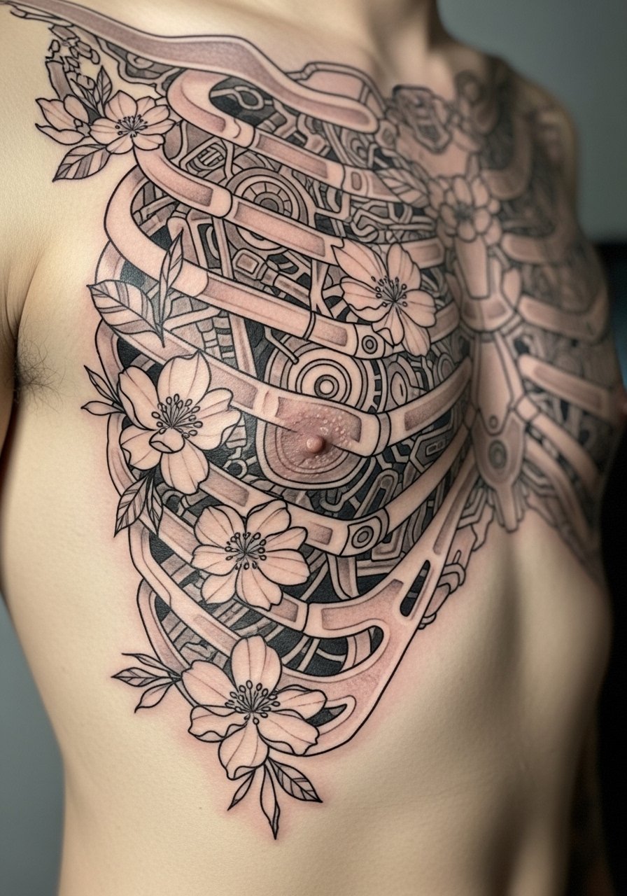 Combining organic blooms with mechanical ribs creates conflict between nature and machine—classic cyberpunk. Ribs are painful, so plan multiple shorter sessions. Bold blacks anchor the piece so flowers don’t vanish as lines soften. A common misstep is too many thin petal veins—they blur; ask for solid petal shapes. Heals into a textured, layered composition.