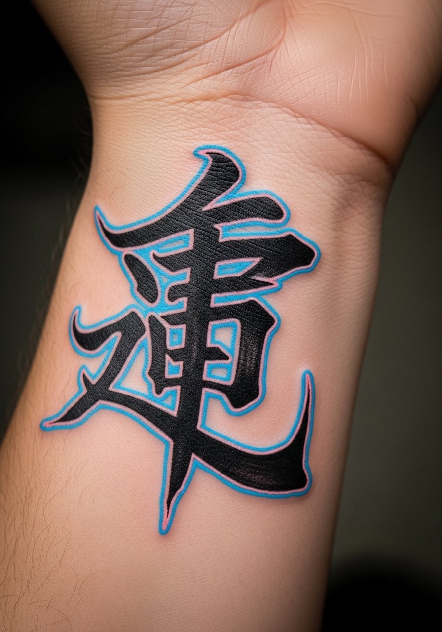 Kanji with neon halos blends traditional calligraphy and future light. Wrists show movement and are visible. Stroke weight is essential; too thin and the characters degrade. I recommend slightly heavier calligraphy than you think. Neon halos are for flair; ensure the character itself has enough contrast to remain legible after healing.