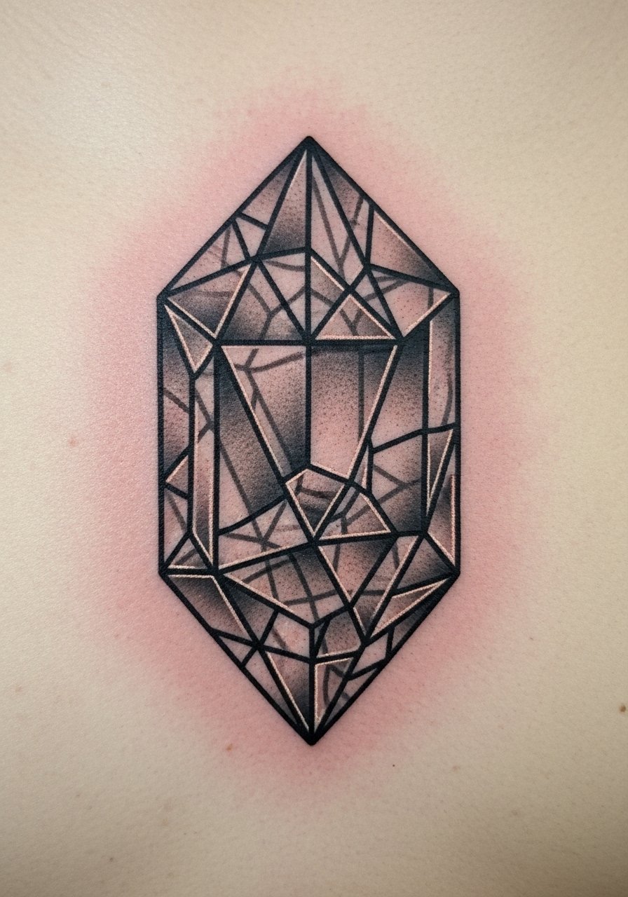 Sternum pieces are bold and painful but read as central insignia. Faceted "data crystals" with sharp planes hold well if blacks are deep. Shading around edges needs saturation to avoid patchiness. Beware tiny facets—larger planes maintain the crystal illusion as lines soften.