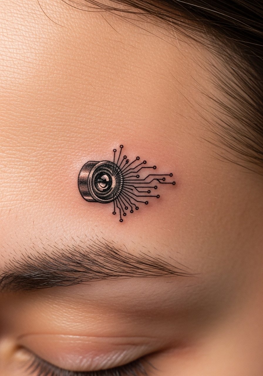Temple and face-adjacent areas are very visible and sensitive. Small sensor eyes read like implants but require light maintenance. Lines here can blur faster due to facial movement; artists often keep shading soft and anchors bold. Consider social and workplace implications—this spot is high-visibility.