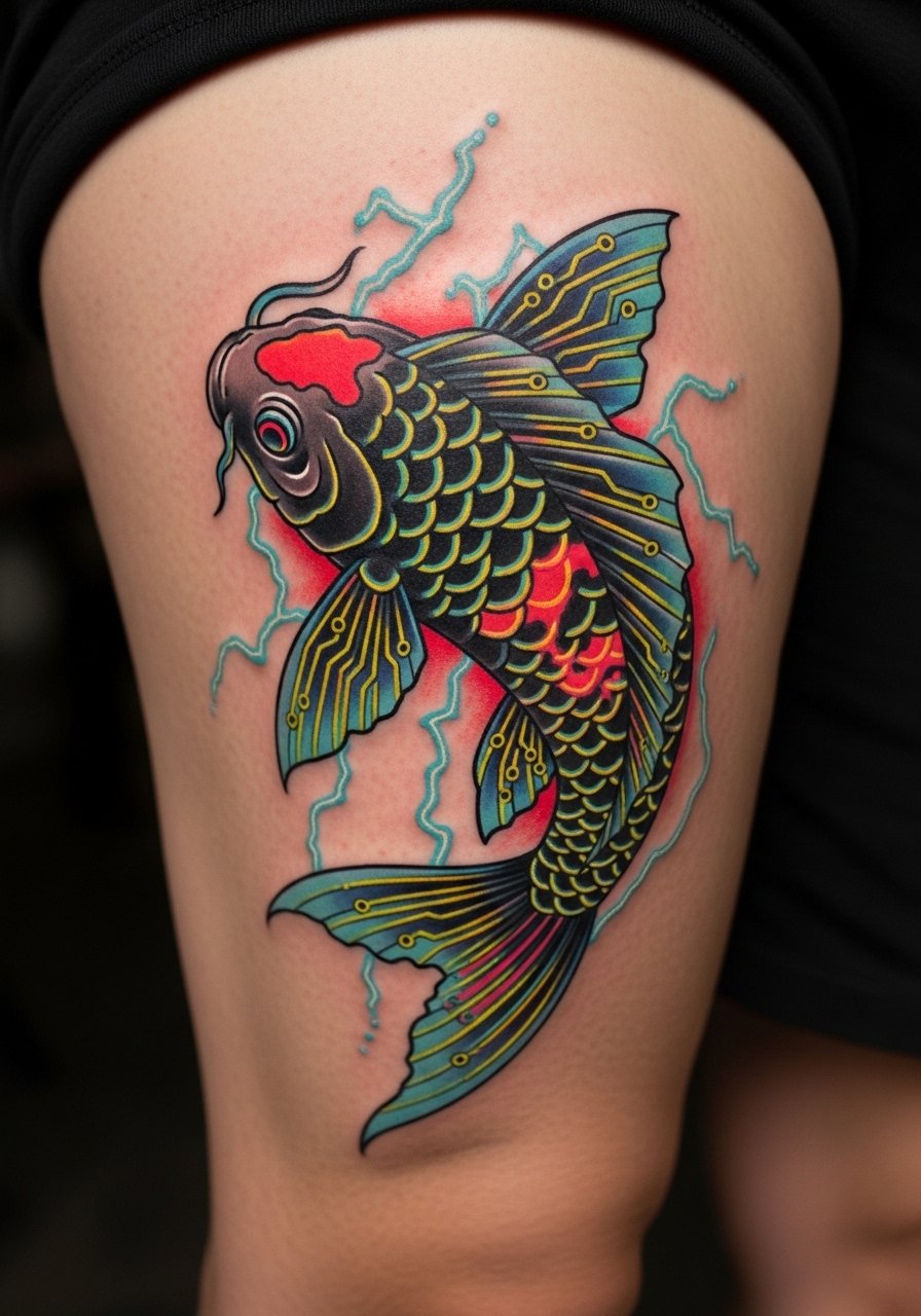 Koi motifs translated into cyber scales feel familiar yet futuristic. Thighs are forgiving for color saturation; neon highlights give a glowing underlay. Keep outlines solid to prevent color bleed. Avoid overly tiny circuit texture that will muddy—bold scale patterns read better over time.
