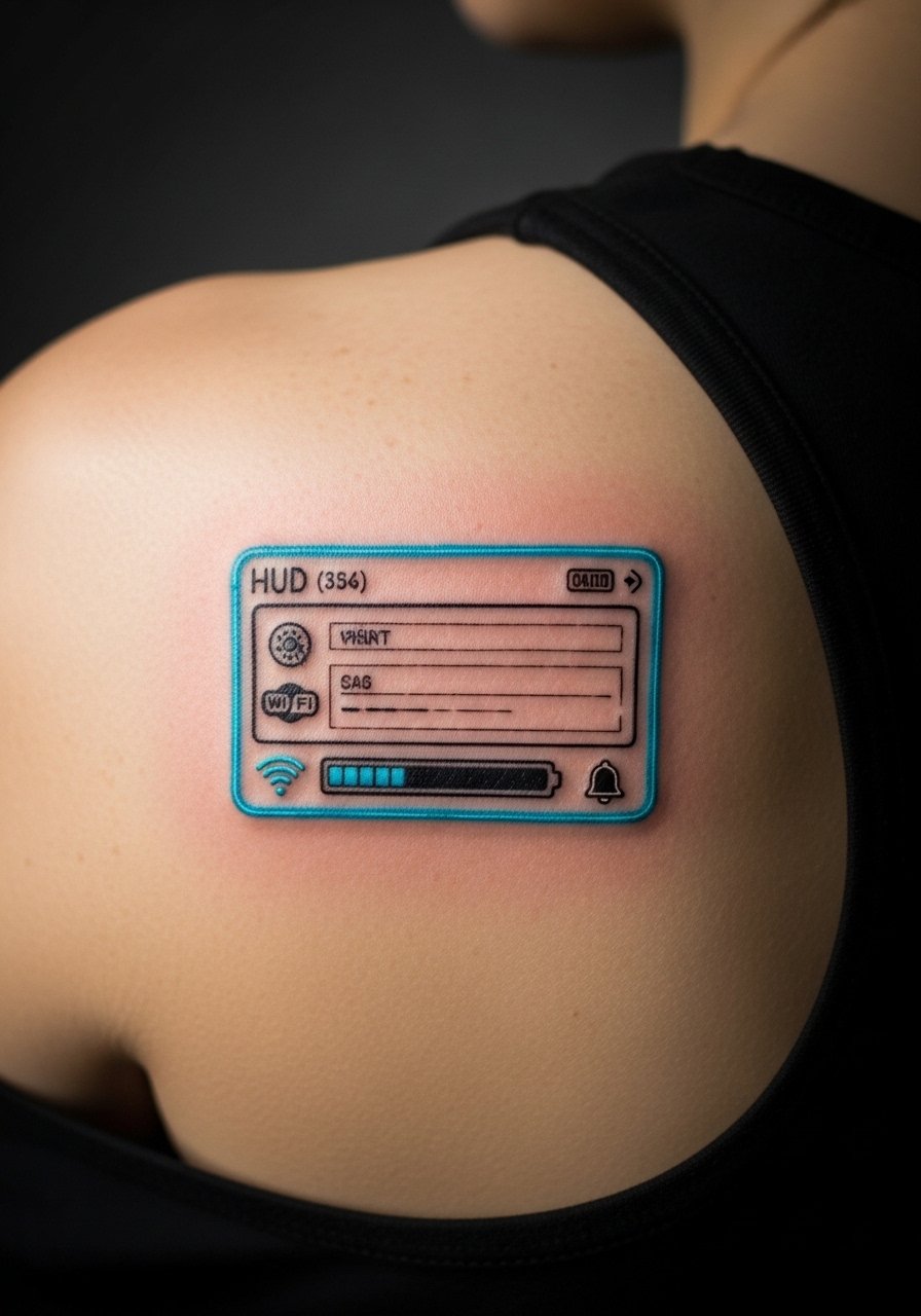 HUD panels translate interface elements into skin—icons, bars, and circular motifs. Shoulder blade movement flatters the layout. Fine lines need slight weight to survive the first year. I’ve seen panels with too many micro-icons lose readability—pick a few strong elements and let them breathe.