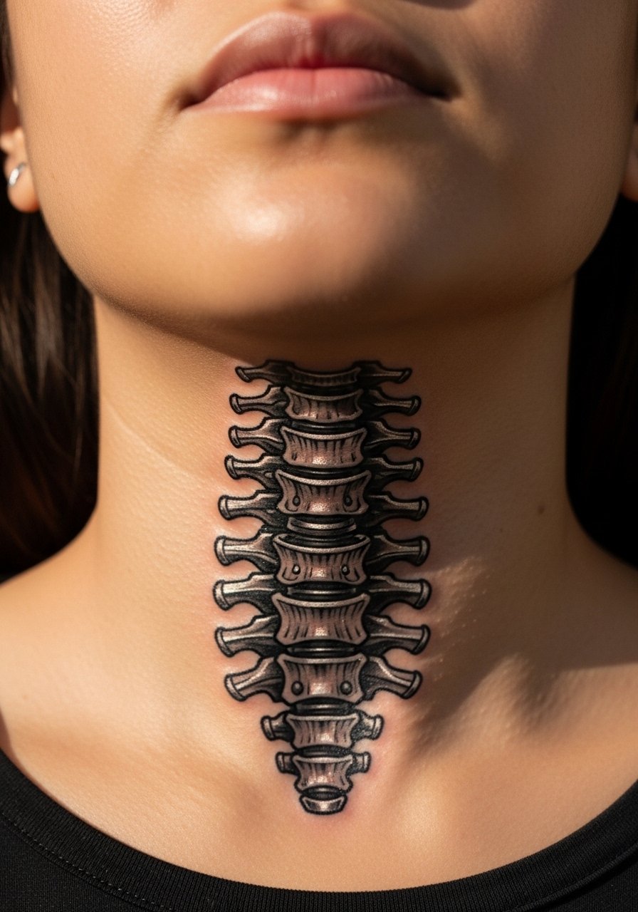 Neck and throat pieces are high-visibility and painful. A vertical robotic vertebrae motif reads as an implanted column. Healed clarity depends on robust blacks—thin lines fade quickly. Expect sensitivity and longer healing; avoid if you need a low-profile look for professional reasons.