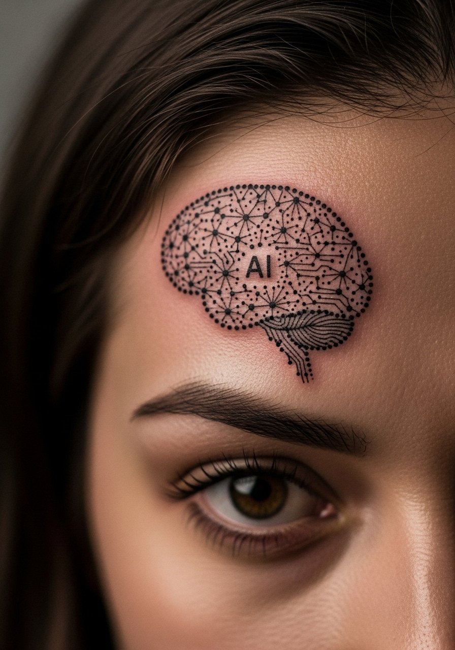 A small brain patch near the temple suggests augmented cognition. Placement is sensitive and visible; dotwork can create a textured neural feel that holds well if dots are spaced. Tiny circuit traces can blur—ask for bold anchors. This reads thoughtful and tech-forward when healed.