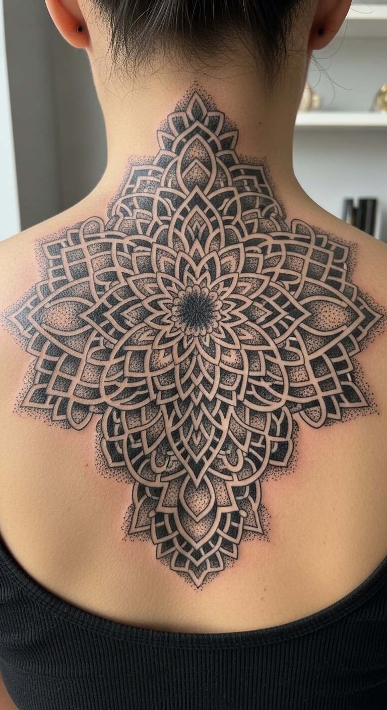 Blackwork Geometric Mandala on Spine