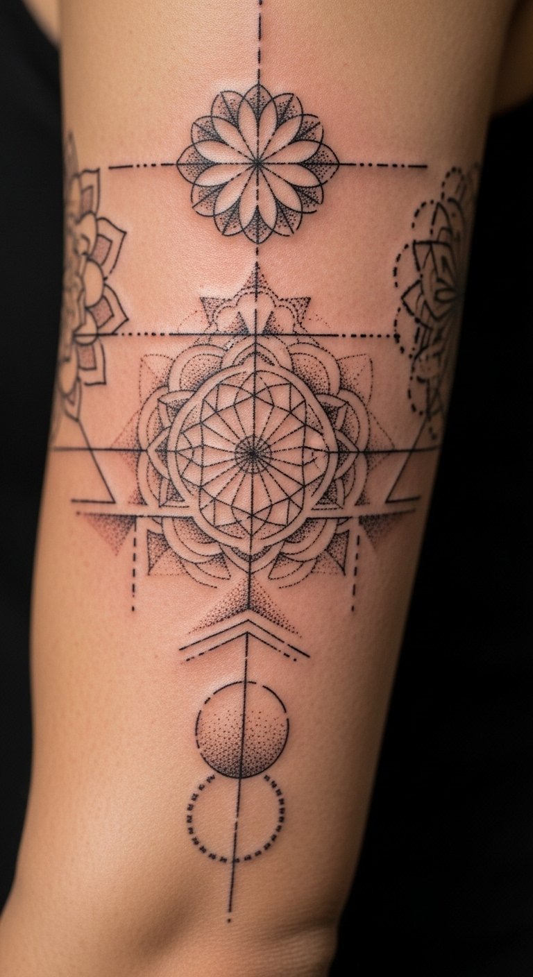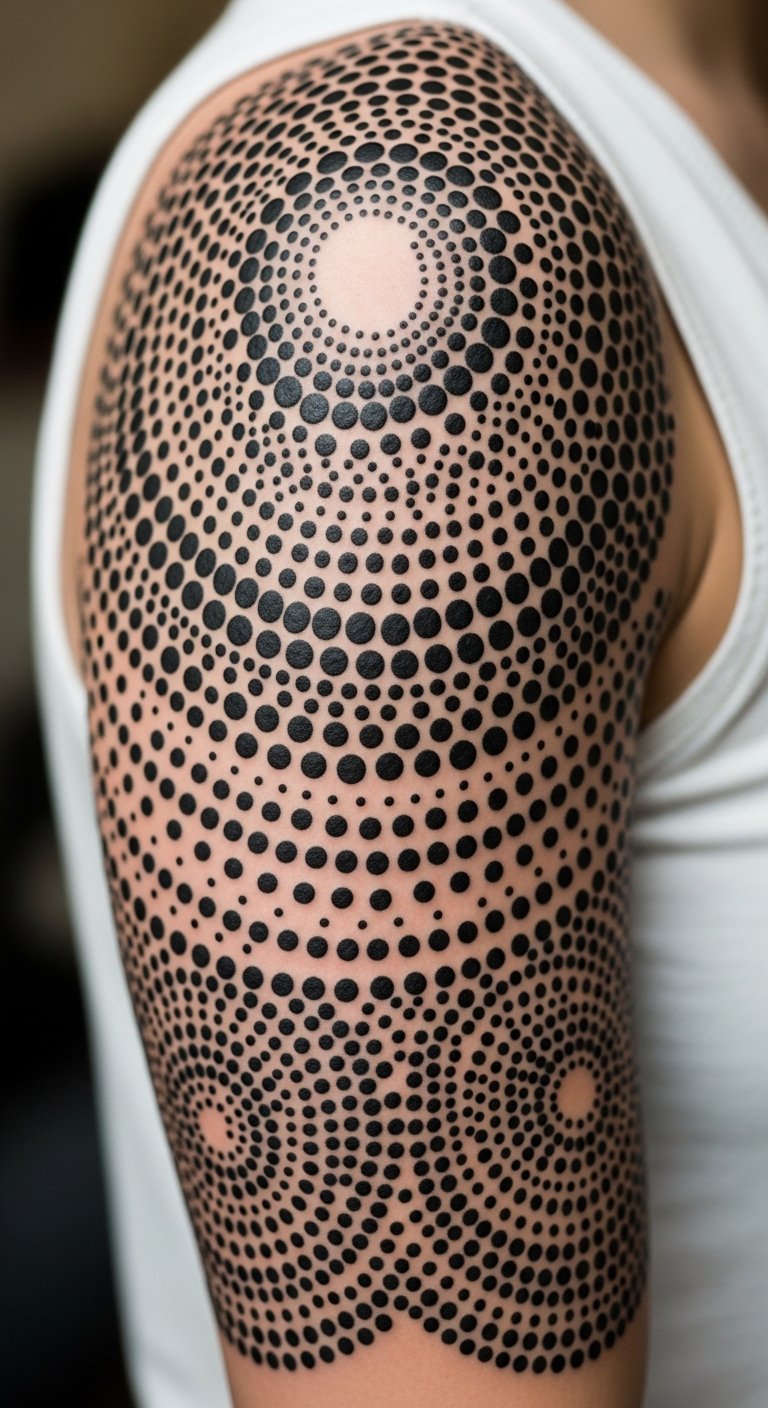 A concentric circle sleeve uses dot density to form gradients and implied shading. On the upper arm it wraps neatly and moves with muscle, so the design breathes when you flex. Pain is moderate here because the area has muscle and tissue. Sessions let you build depth gradually. In real life the crispness you see fresh will soften: the outer edges of tiny dots blend, which I actually like because it creates a dusty gradient. Common mistake: making circles too small—keep scale bold so the stippling doesn’t become a grey blur over time. Ask for healed photos of sleeves from the artist. Aftercare emphasis: gentle cleansing and light moisturizing to preserve crisp dots while skin regenerates.