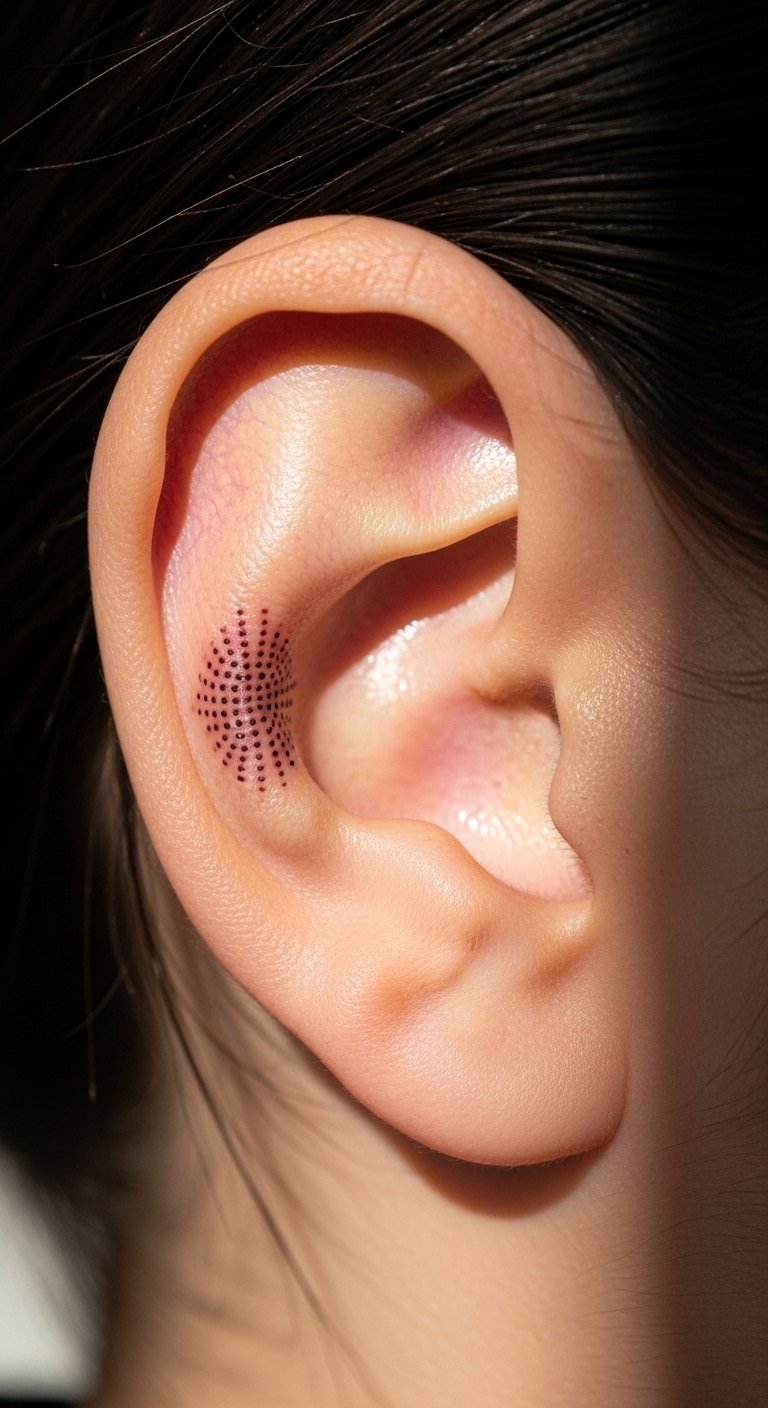 Behind the ear is tricky—small, discrete, and a real pain spot because of cartilage. Micro dotwork here looks hypnotic when placed right, like a tiny star field when hair parts. I’d call this for someone comfortable with short, sharper pain and wanting low visibility. Healing is faster for small spots but watch for scabbing near hair and natural oils. The main mistake is trying to cram too much geometry into a tiny area; simplify and use negative space. Ask your artist if they’ve done healed micro dotwork on cartilage—this placement needs steady hands and healed photos to trust the outcome.